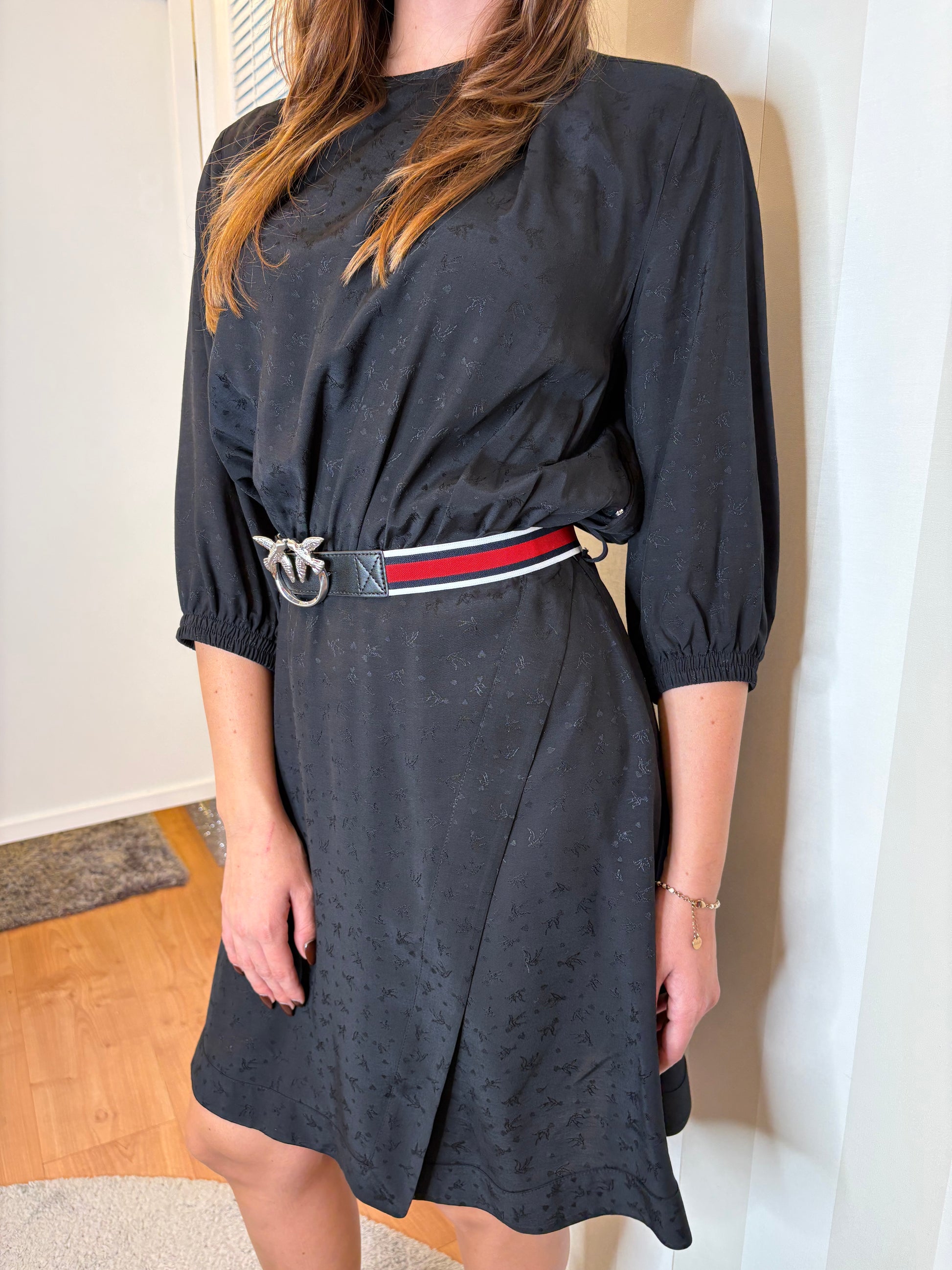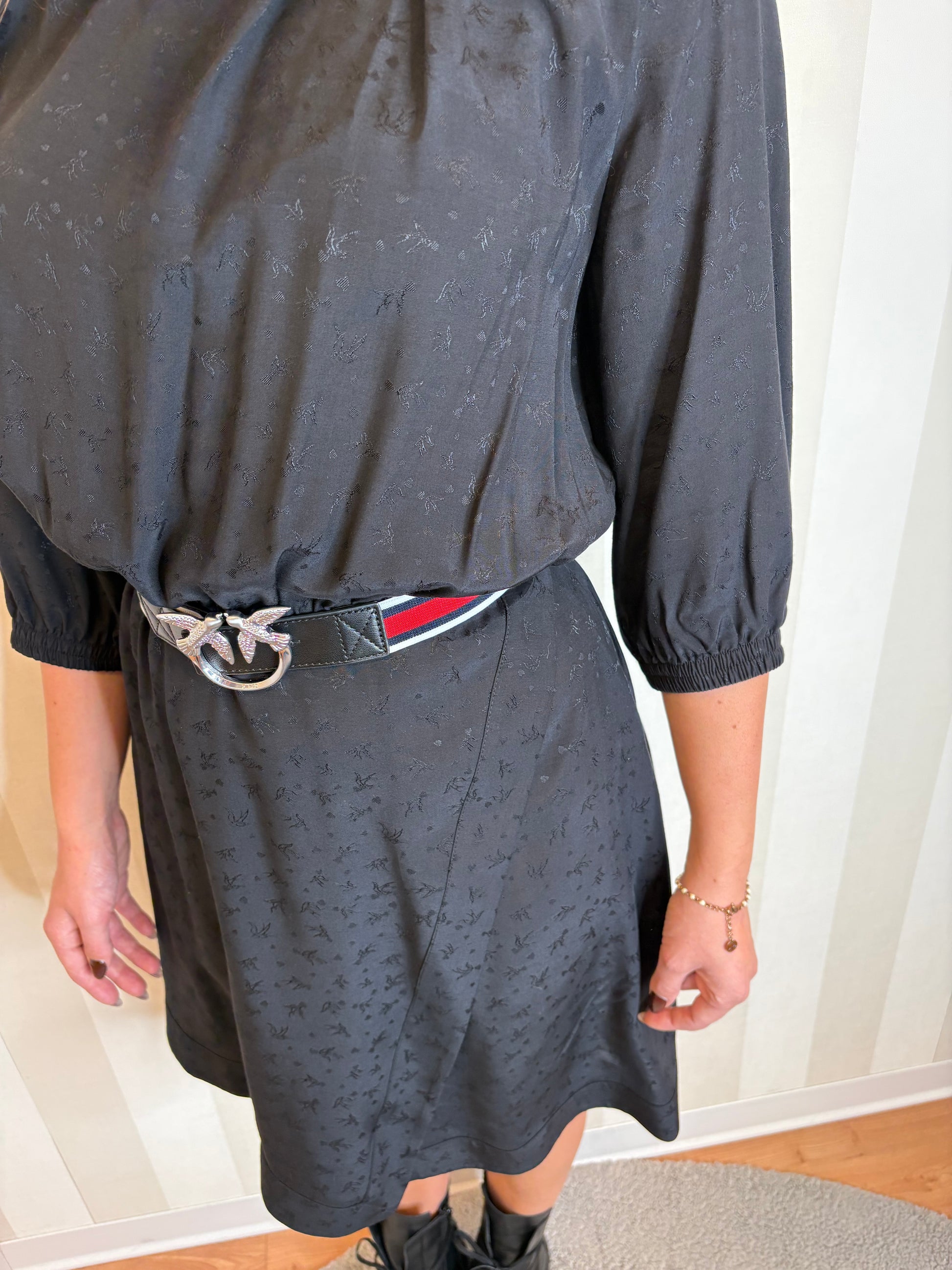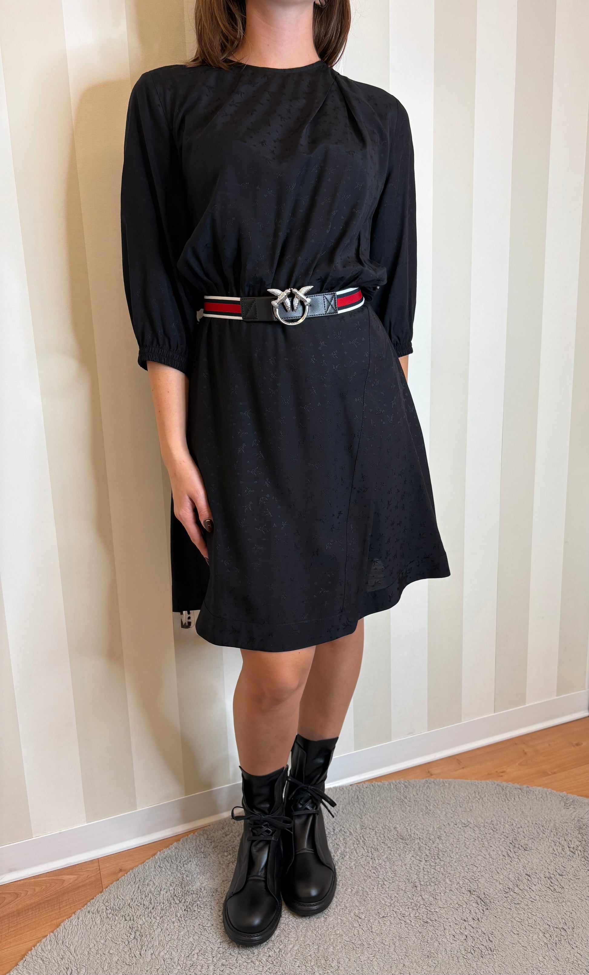 Abito corto girocollo con maniche a tre quarti rifinite con arriccio, gonna a portafoglio e cintura a contrasto con fibbia Love Birds. Il capo è realizzato in viscosa jacquard e la texture è personalizzata con un motivo con logo Love Birds. Il modello presenta una vestibilità sfiancata, più aderente sui fianchi. Chiusura con bottone e cut-out a goccia sul retro. Indossalo tutti i giorni per avere praticità, romanticismo e femminilità in un unico capo da poter sfoggiare dall'ufficio fino all'aperitivo.