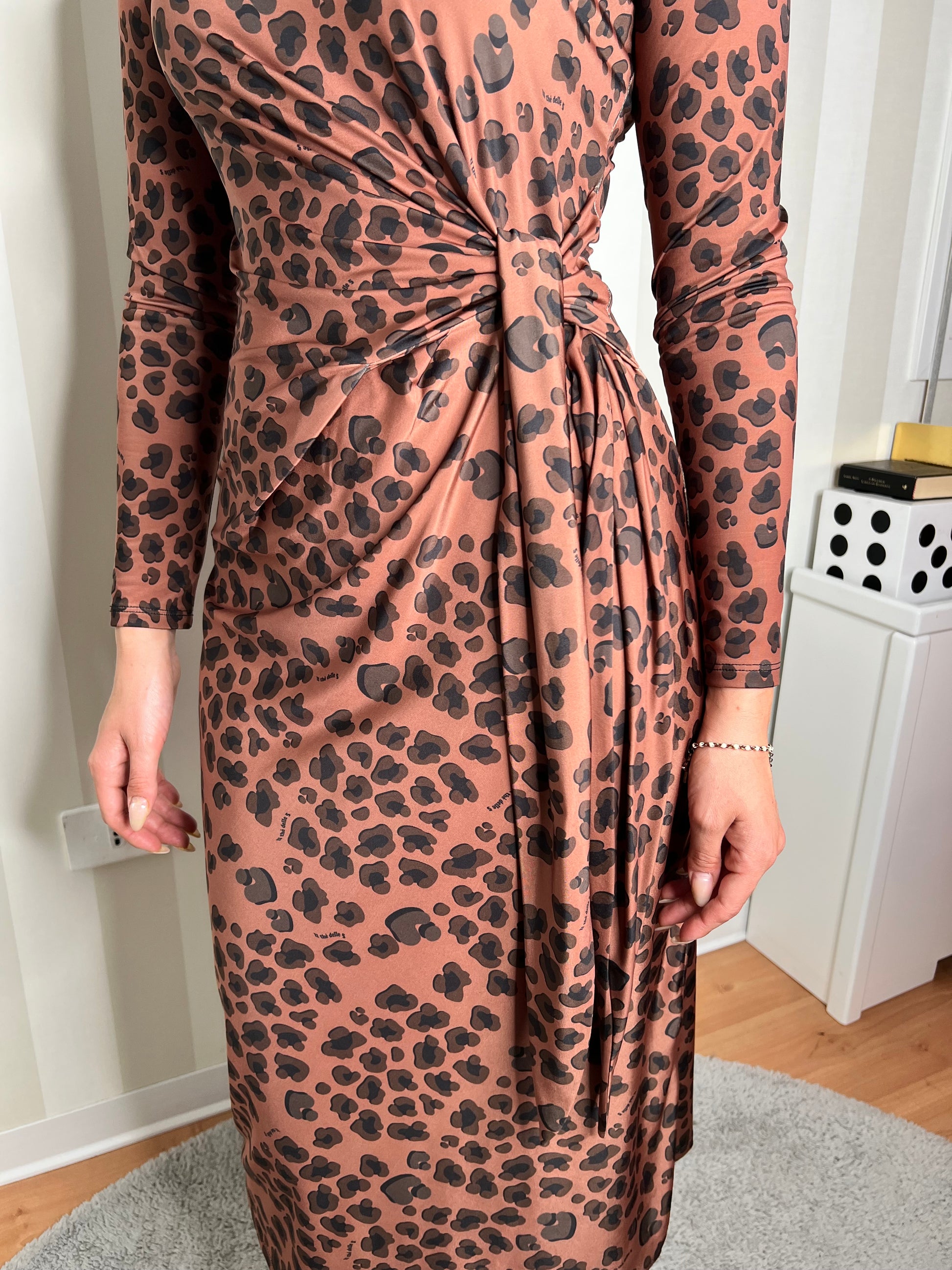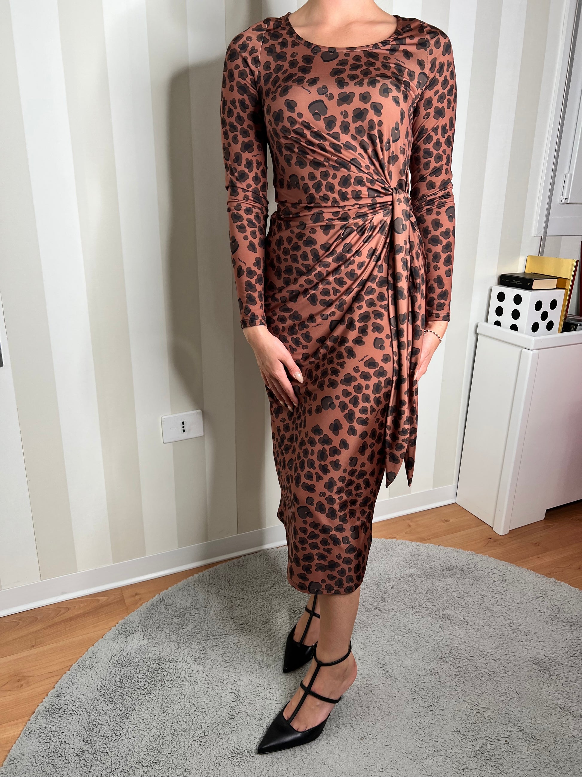 Abito con micro fantasia dalla linea aderente che segue le forme del tuo corpo, a maniche lunghe con scollo rotondo semplice. Presenta un dettaglio drappeggiato laterale con un nodo che cade morbido creando un effetto asimmetrico che valorizza la silhouette.
