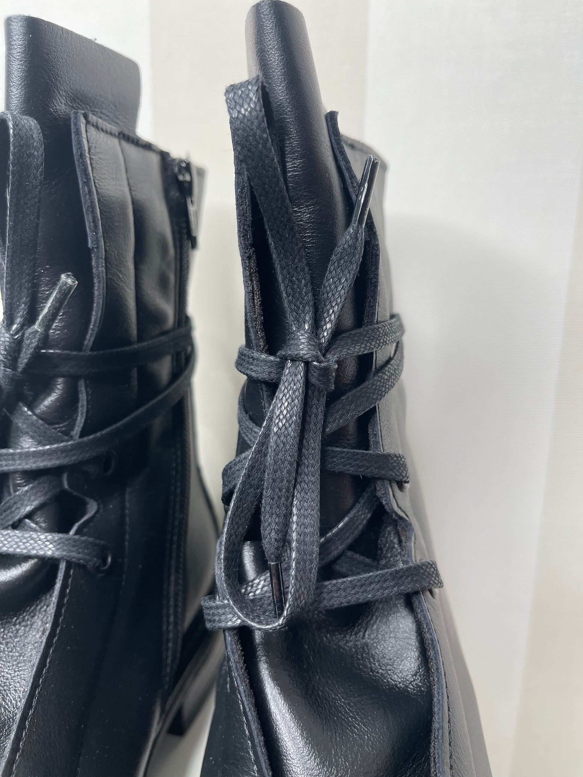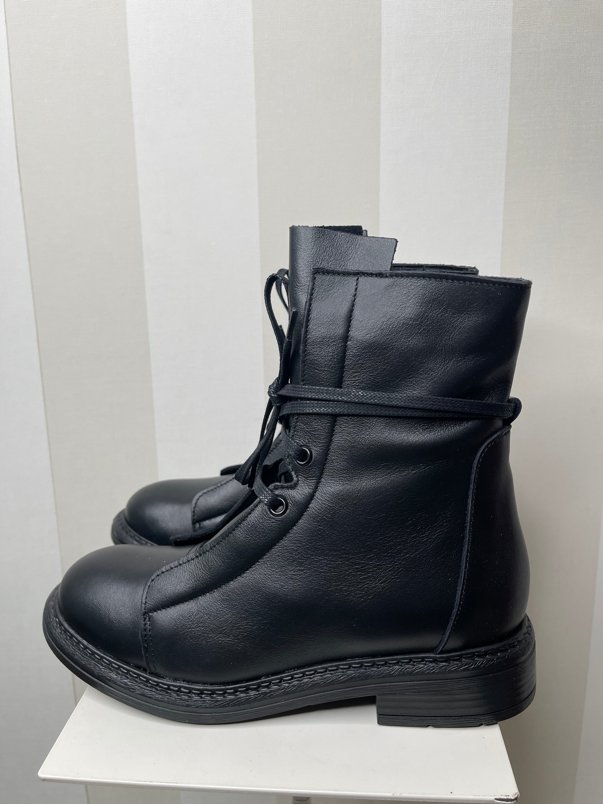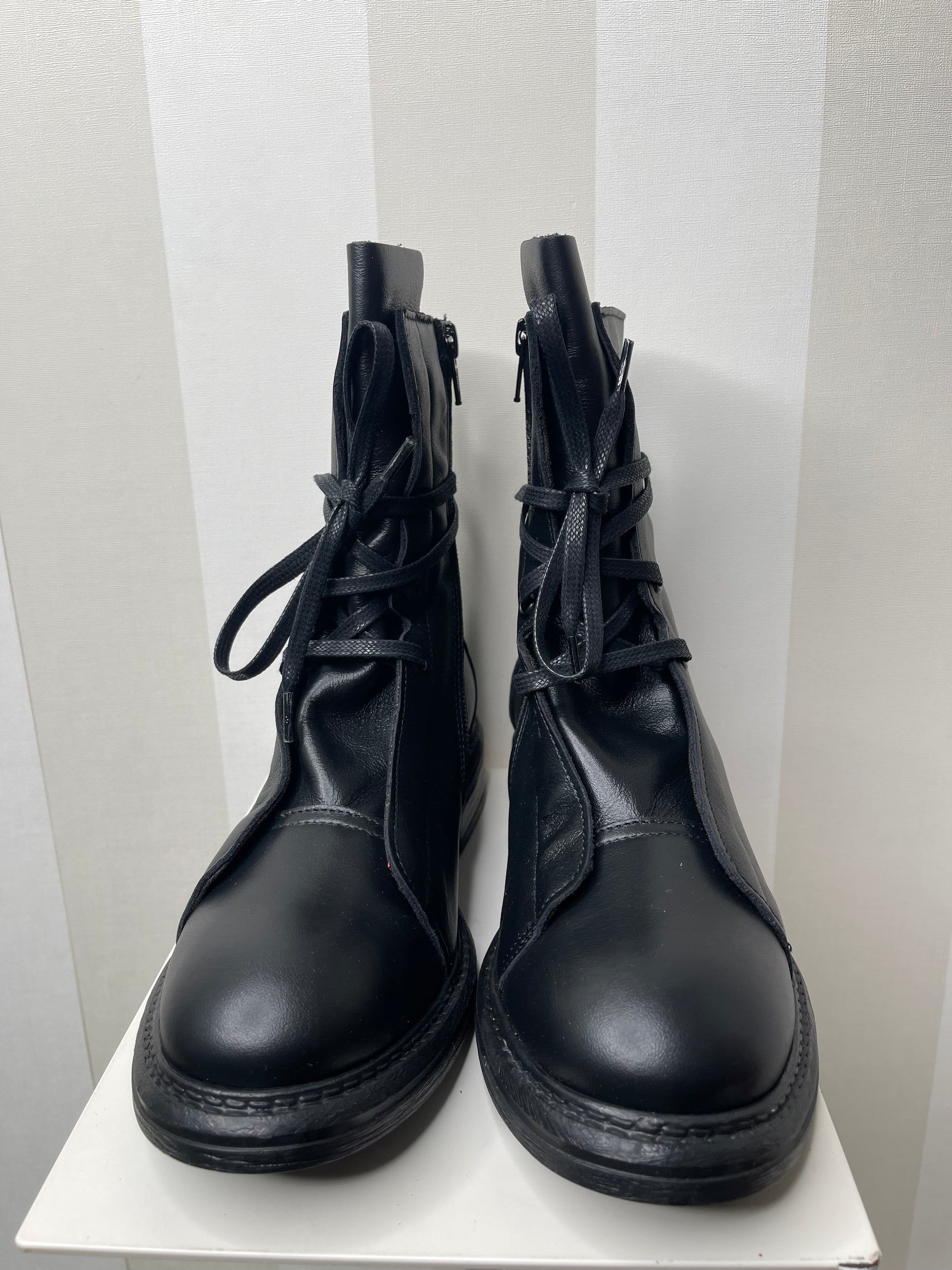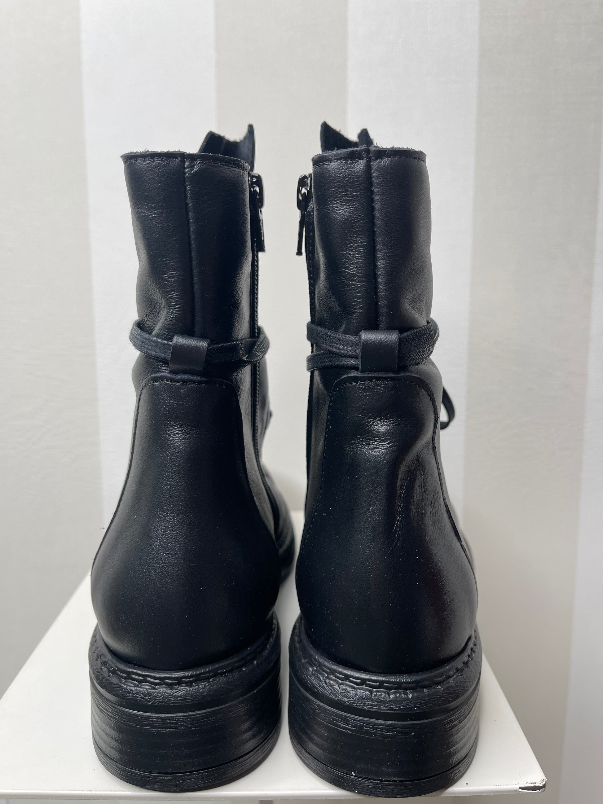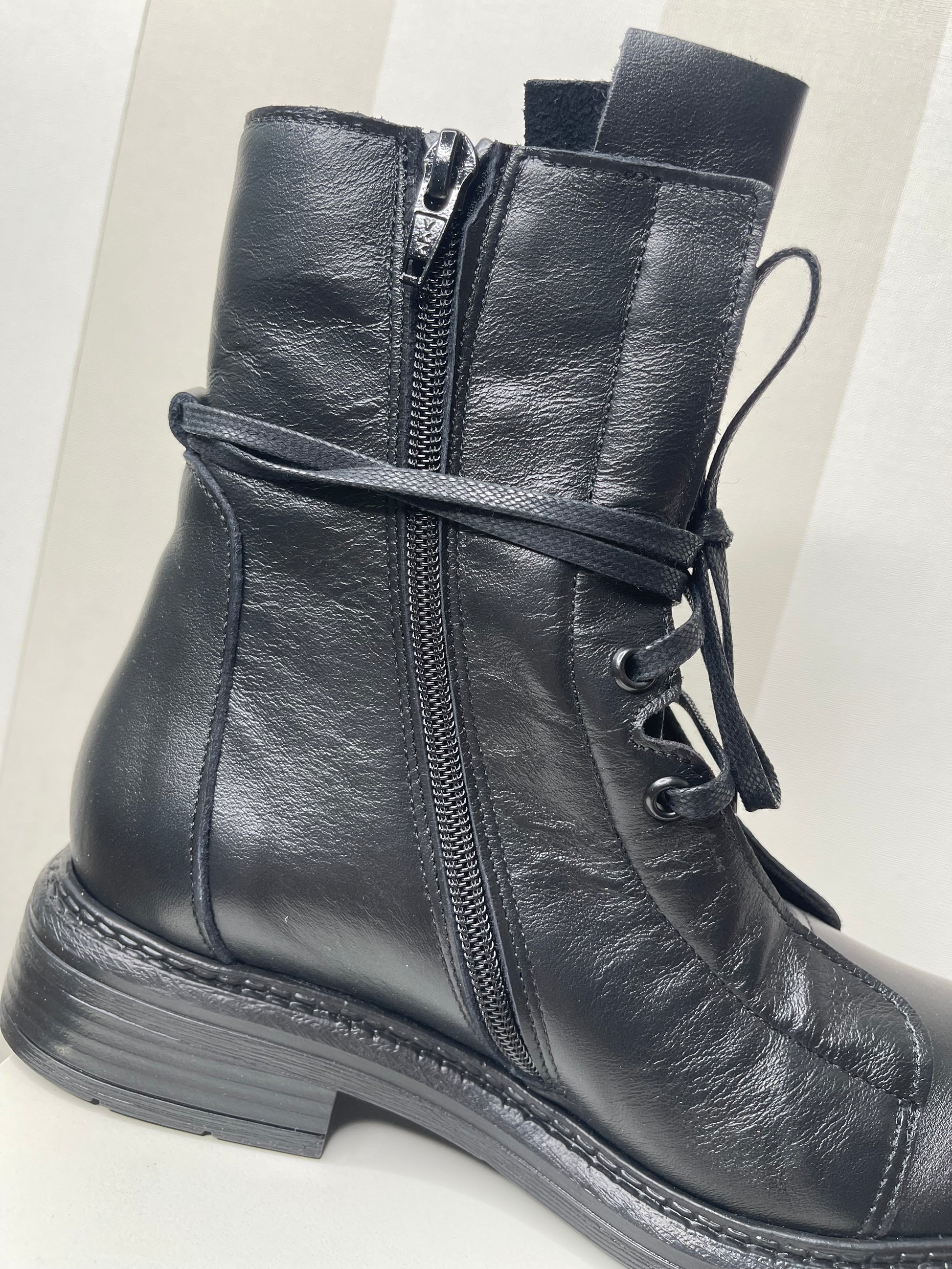 Gli anfibi neri rappresentano un perfetto connubio tra eleganza e grinta. Realizzati in pelle, questi anfibi vantano un look minimalista ma pieno di carattere. Il design con allacciatura frontale e linguetta leggermente sollevata conferisce un tocco retrò e contemporaneo al tempo stesso. La suola in gomma robusta assicura comodità e resistenza, perfetta per lunghe camminate ma con stile. Zip laterale pratica.La calzatura, pur mantenendo il classico stile da anfibio, è resa sofisticata dalla qualità della pelle.Perfetti da abbinare con jeans skinny, possono essere indossati anche con una gonna o un abito per creare un contrasto audace e femminile. Ottimi sia per il giorno che per la sera,si adattano a diverse situazioni, dalle giornate tranquille alle serate più informali.