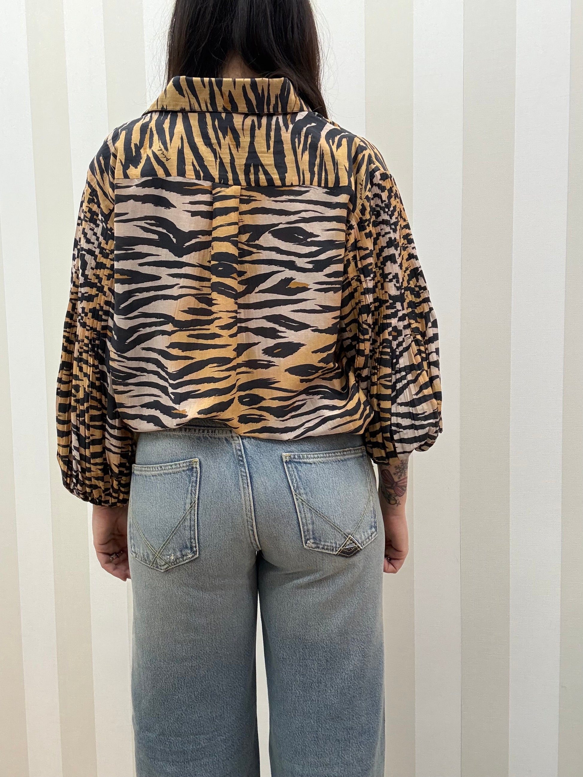 Blusa morbida e vaporosa realizzata in un tessuto di cotone e seta dall'aspetto leggero e luminoso. Dotato di un colletto in stile camicia e di un'abbottonatura frontale che arriva fino a metà capo, questo modello si distingue per la seducente stampa animalier tigrata e per la particolare lavorazione delle maniche che, grazie a piccole pieghe irregolari, crea volume nella parte alta delle braccia. Il carré con doppia piega sul retro contribuisce ad accentuare la fluidità del tessuto, mentre la fantasia all over rende questo capo la scelta perfetta per donare un tocco di grinta ai tuoi look.