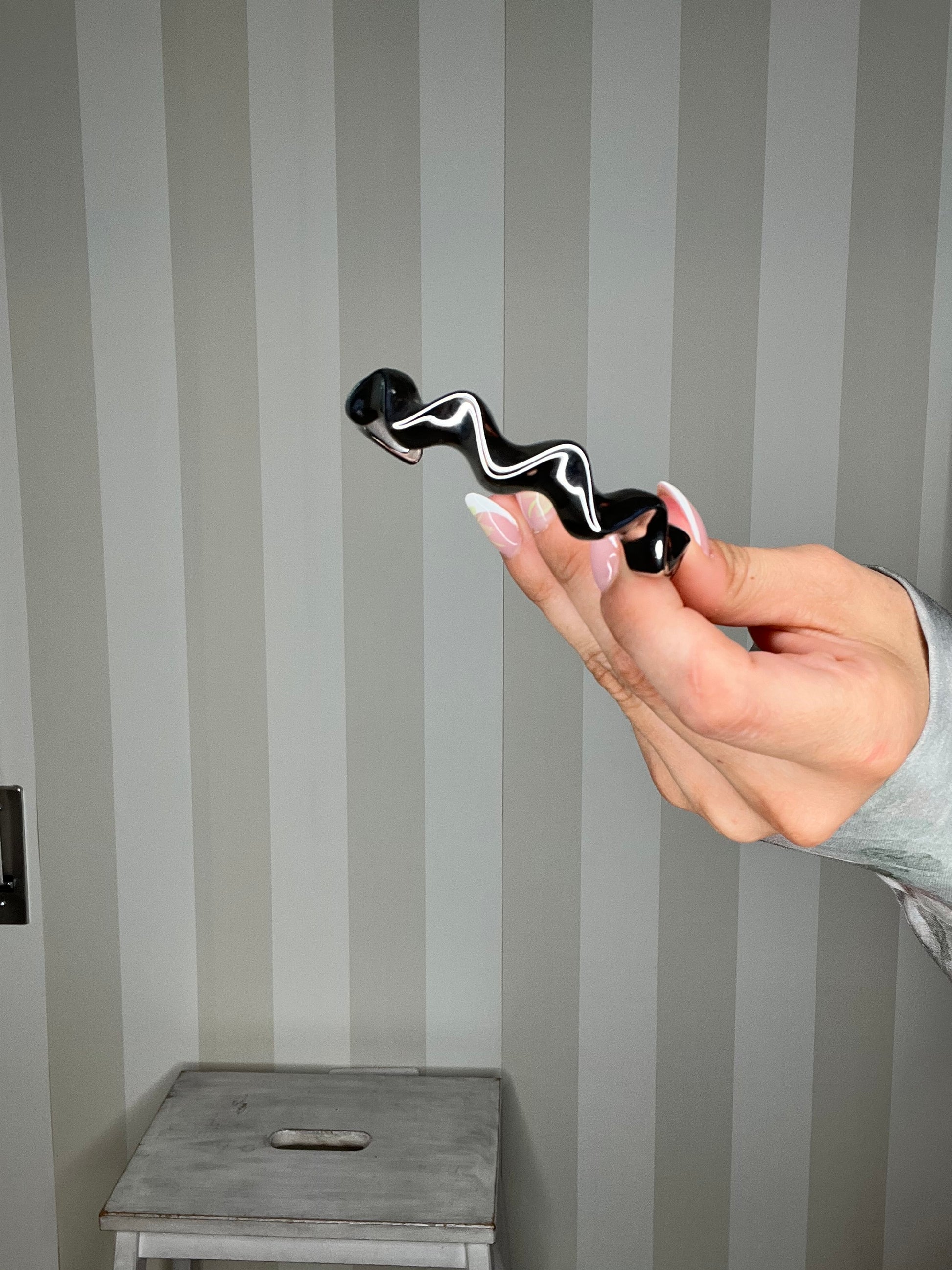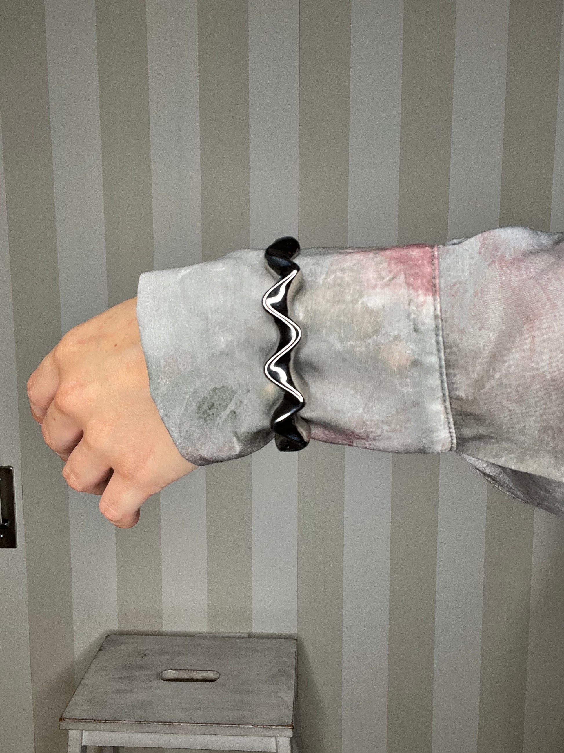 Bracciale rigido in metallo argentato con design ondulato. La finitura lucida e la forma scultorea lo rendono ideale per aggiungere un tocco moderno e sofisticato.