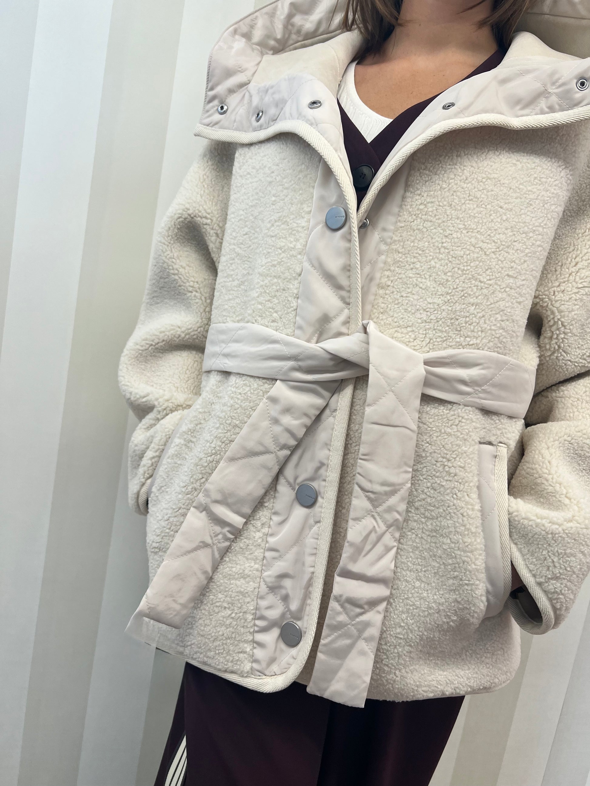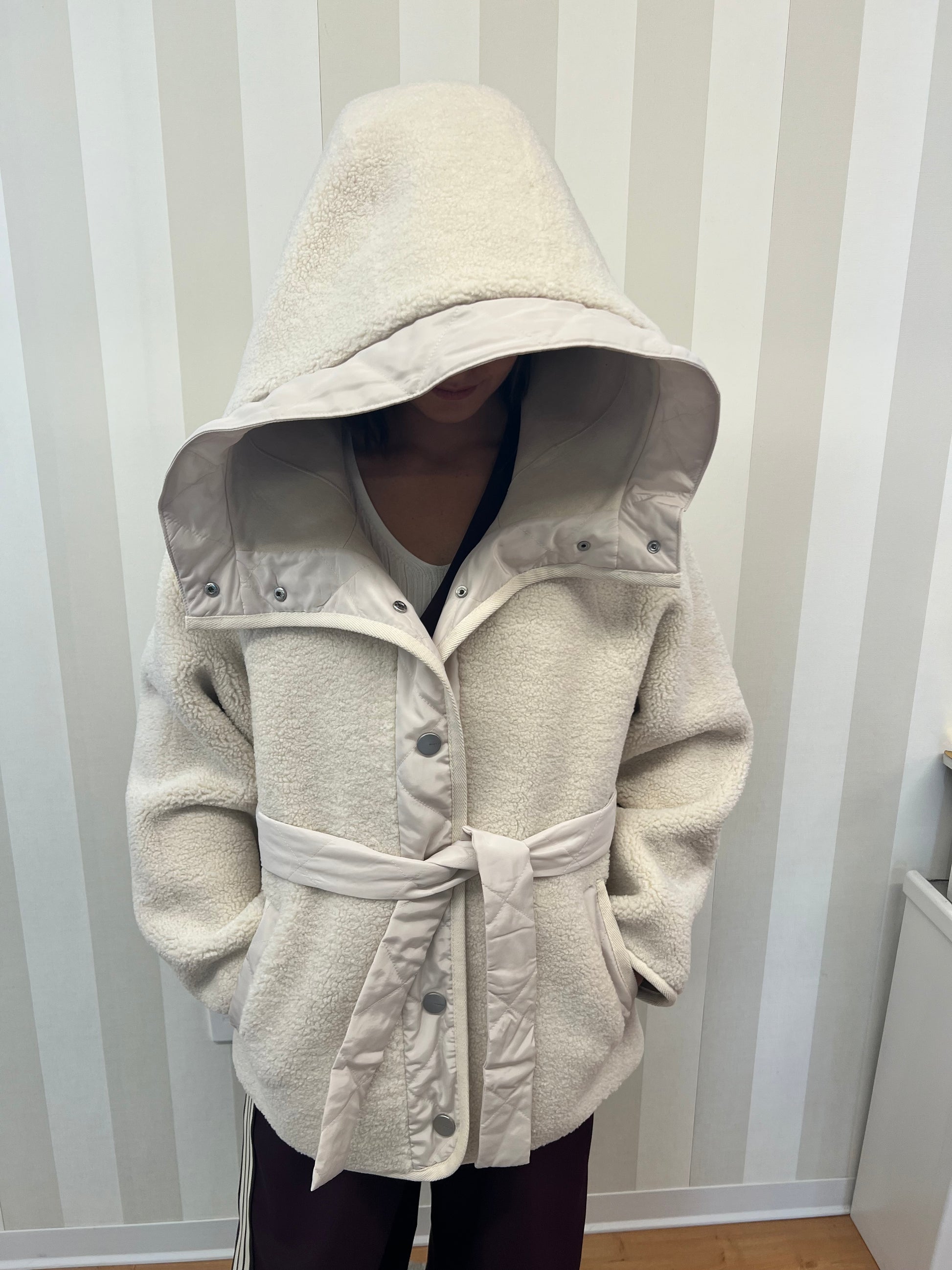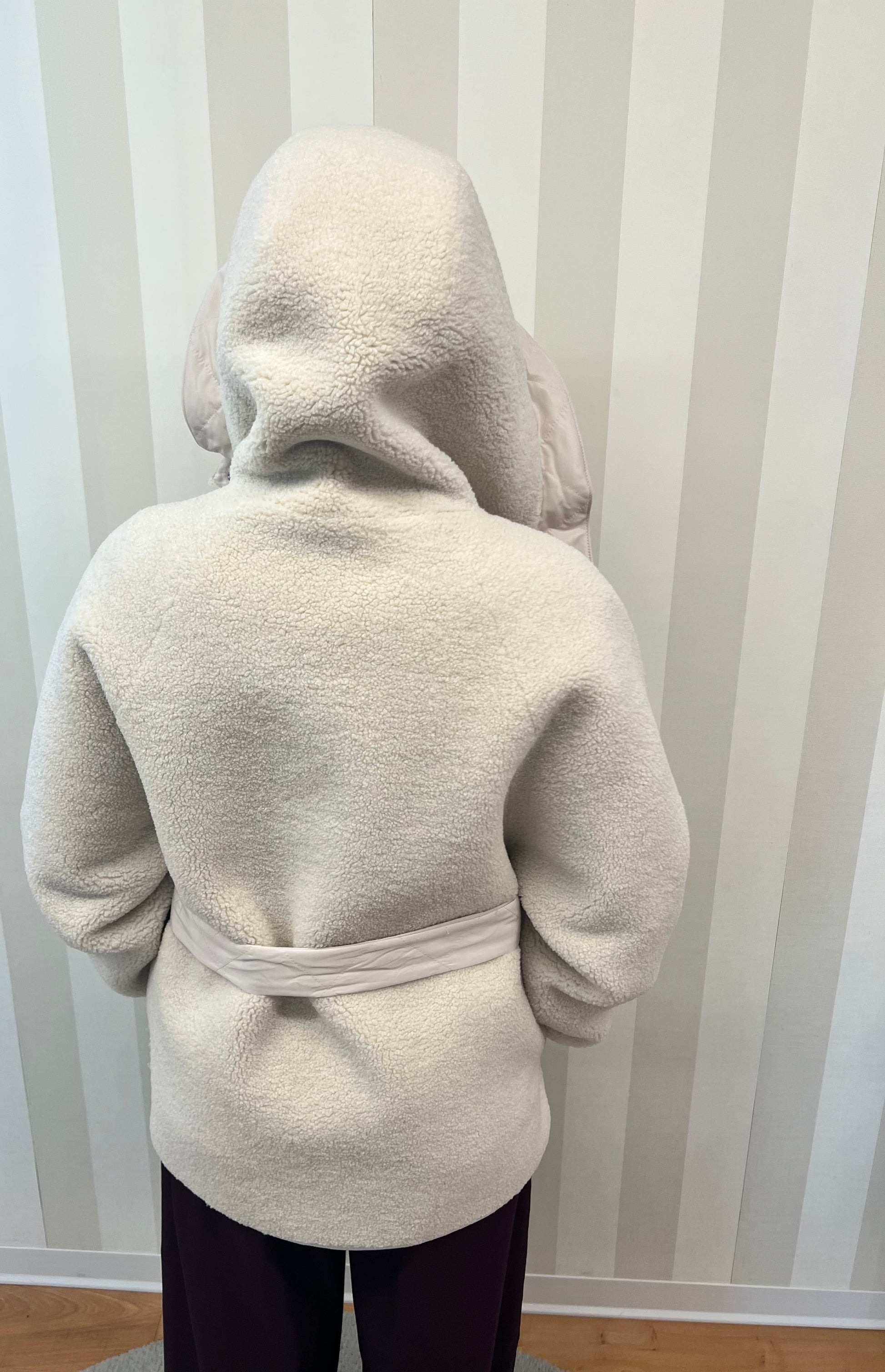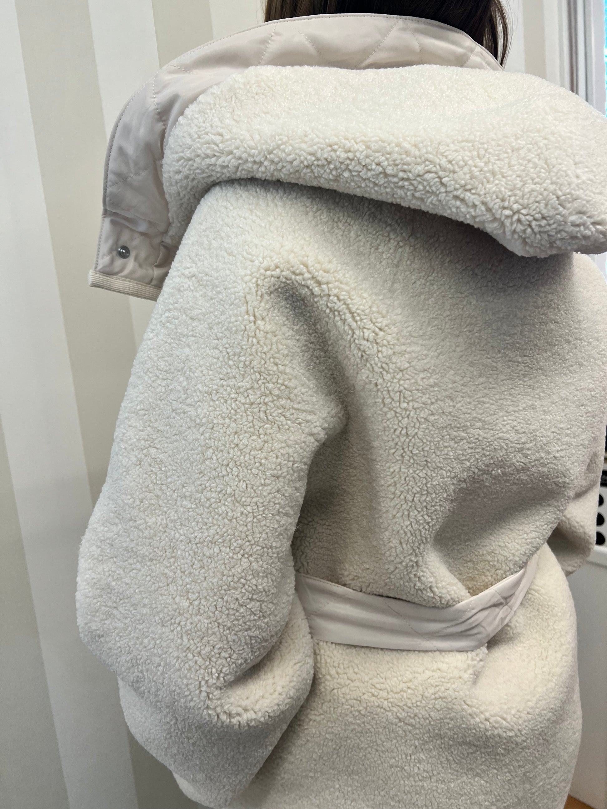 Cappotto corto dalla silhouette caban dotato di ampio cappuccio e realizzato in morbida similpelliccia effetto teddy abbinata a dettagli in tela tecnica, per un look capace di unire stile e funzionalità. Il capo è completo di cintura abbinata, nello stesso tessuto, da annodare in vita. Chiusura con bottoni metallici a pressione.