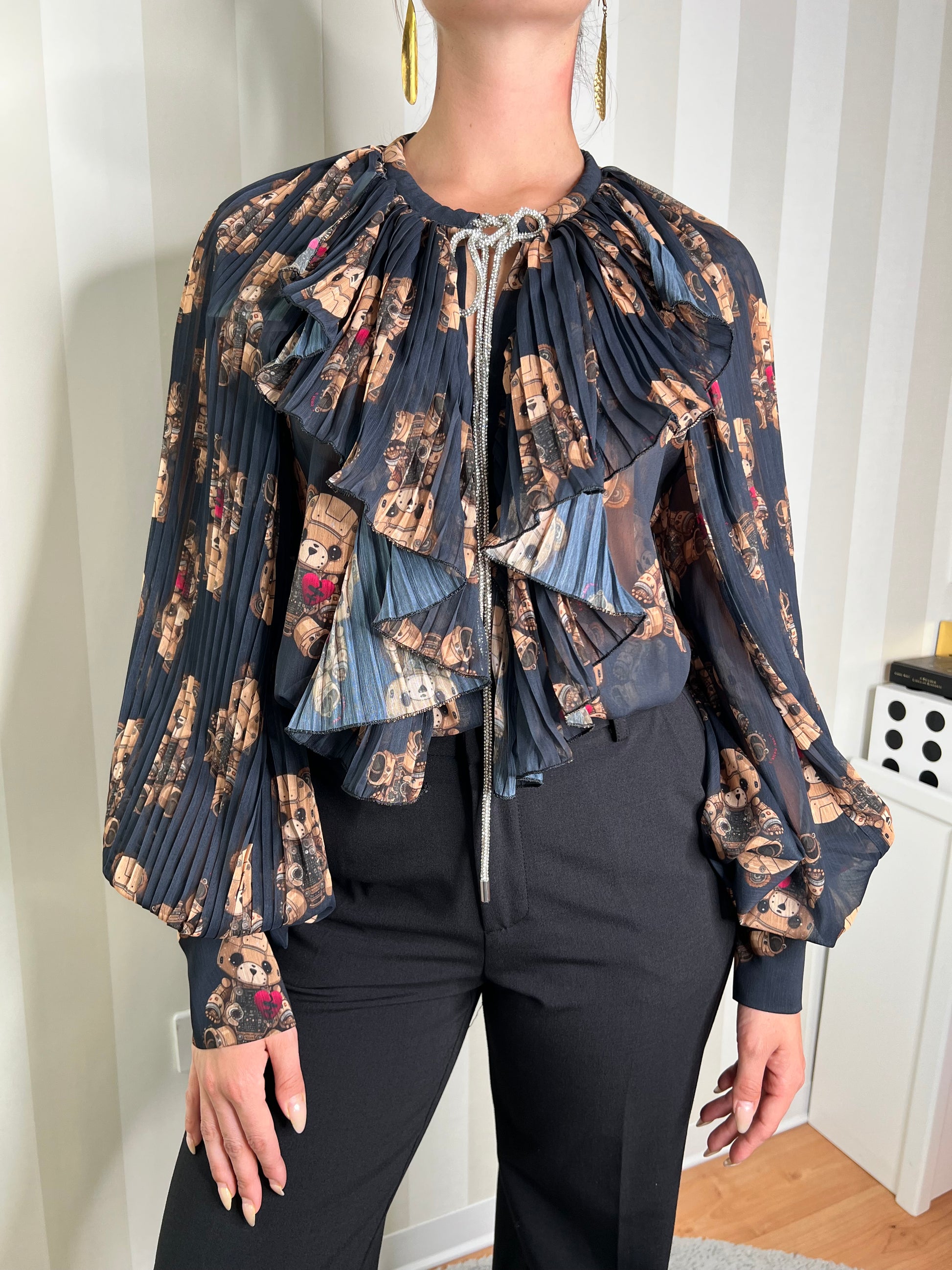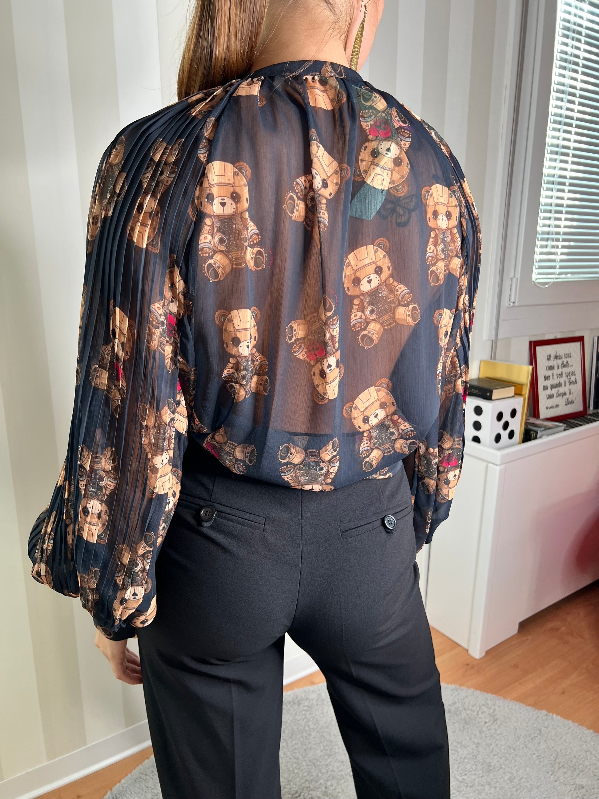 Camicia a maniche lunghe trasparenti e leggermente a sbuffo, rifinite con polsini stretti. Presenta uno scollo rotondo impreziosito da un dettaglio luminoso che permette di regolare la profondità della scollatura. Il décolleté è arricchito da volant a pieghe che donano movimento e carattere al davanti. La fantasia con orsacchiotti robotici unisce eleganza e innovazione, rendendo il capo unico e originale.