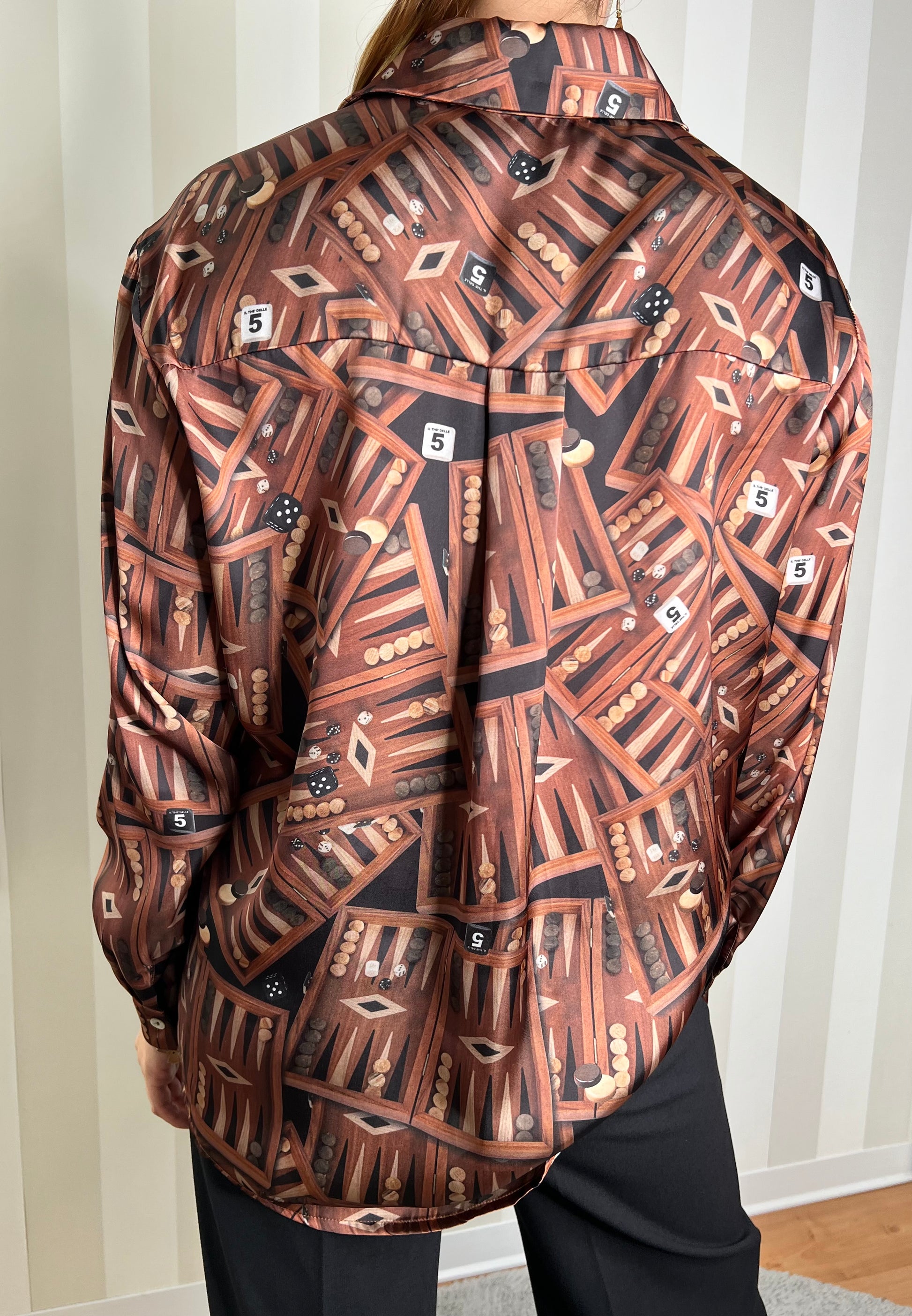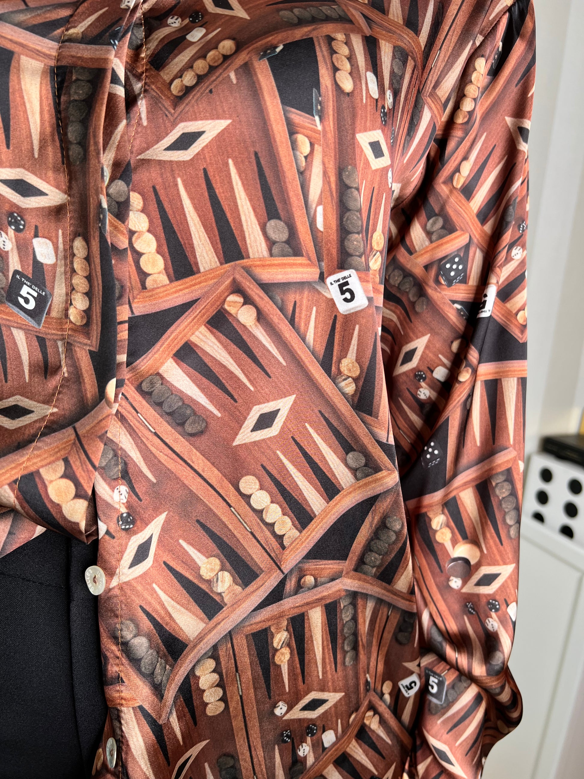 Camicia a maniche lunghe con chiusura frontale a bottoni. Realizzata in tessuto morbido e fluido, è caratterizzata da una fantasia ispirata al celebre gioco da tavolo backgammon, proposta su sfondo marrone e beige a contrasto. Un design originale e particolare che dona un tocco simpatico al capo.