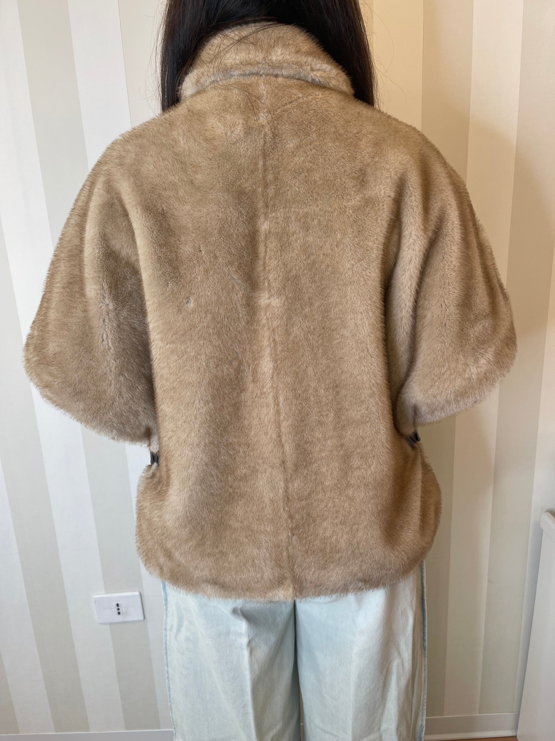 Cappa corta con maniche corte, tasche a filetto, avvolgente collo ripiegato e chiusura frontale decentrata. Il capo è realizzato in morbido tessuto Aspen dall'effetto pelliccia, particolarmente piacevole al tatto. Modello foderato. Il capospalla è ideale per accompagnarti nelle giornate più fresche di inizio stagione all'aperto, con il massimo comfort, senza rinunciare a un tocco di stile.
