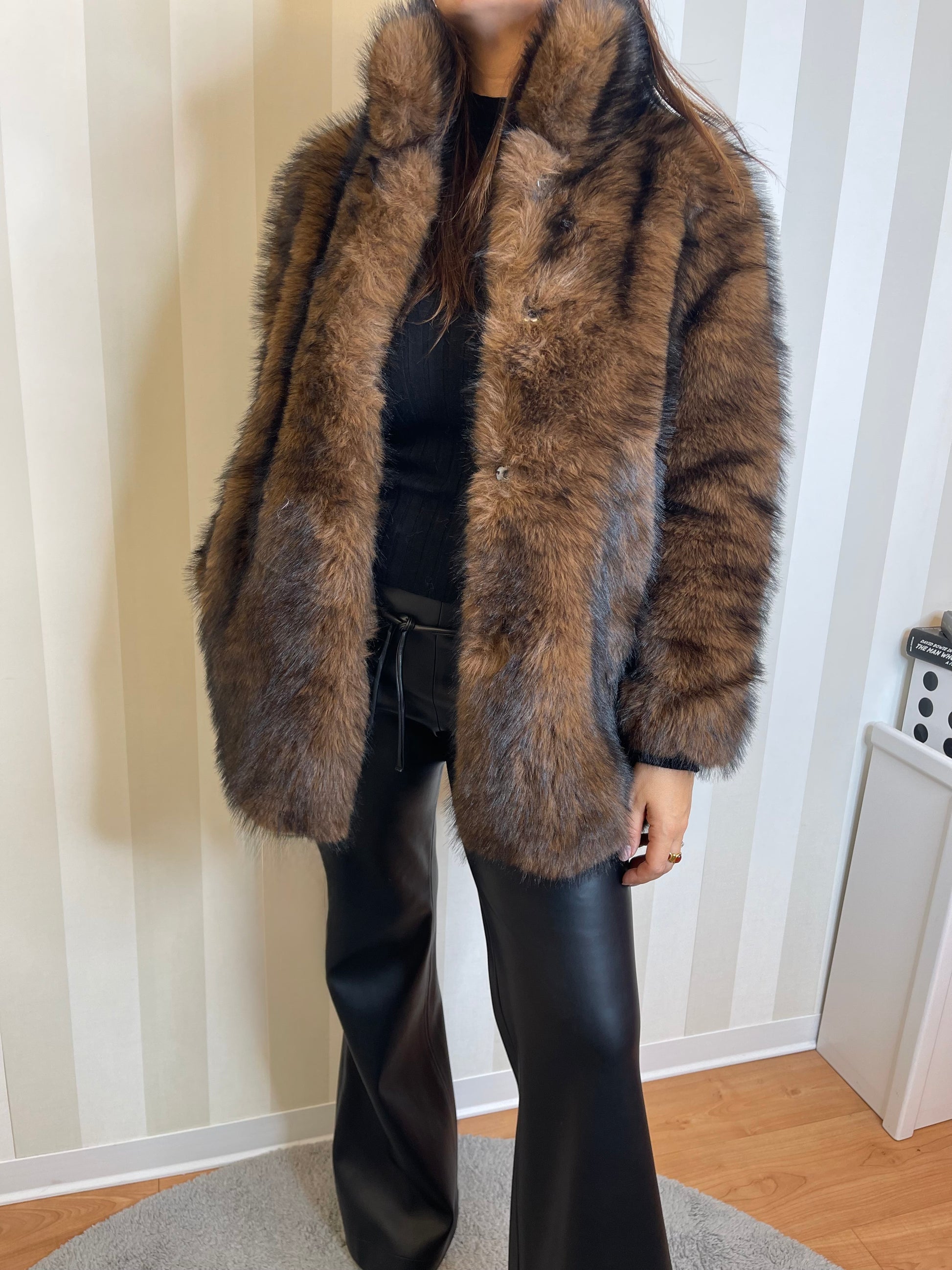 Eco pelliccia dalla mezza lunghezza perfetta per l’inverno freddo,dalle sfumature nere ma soprattutto marroni,colore di punta di questa stagione. Perfetta per ogni occasione,chiusura con bottoni invisibili e colletto alto.