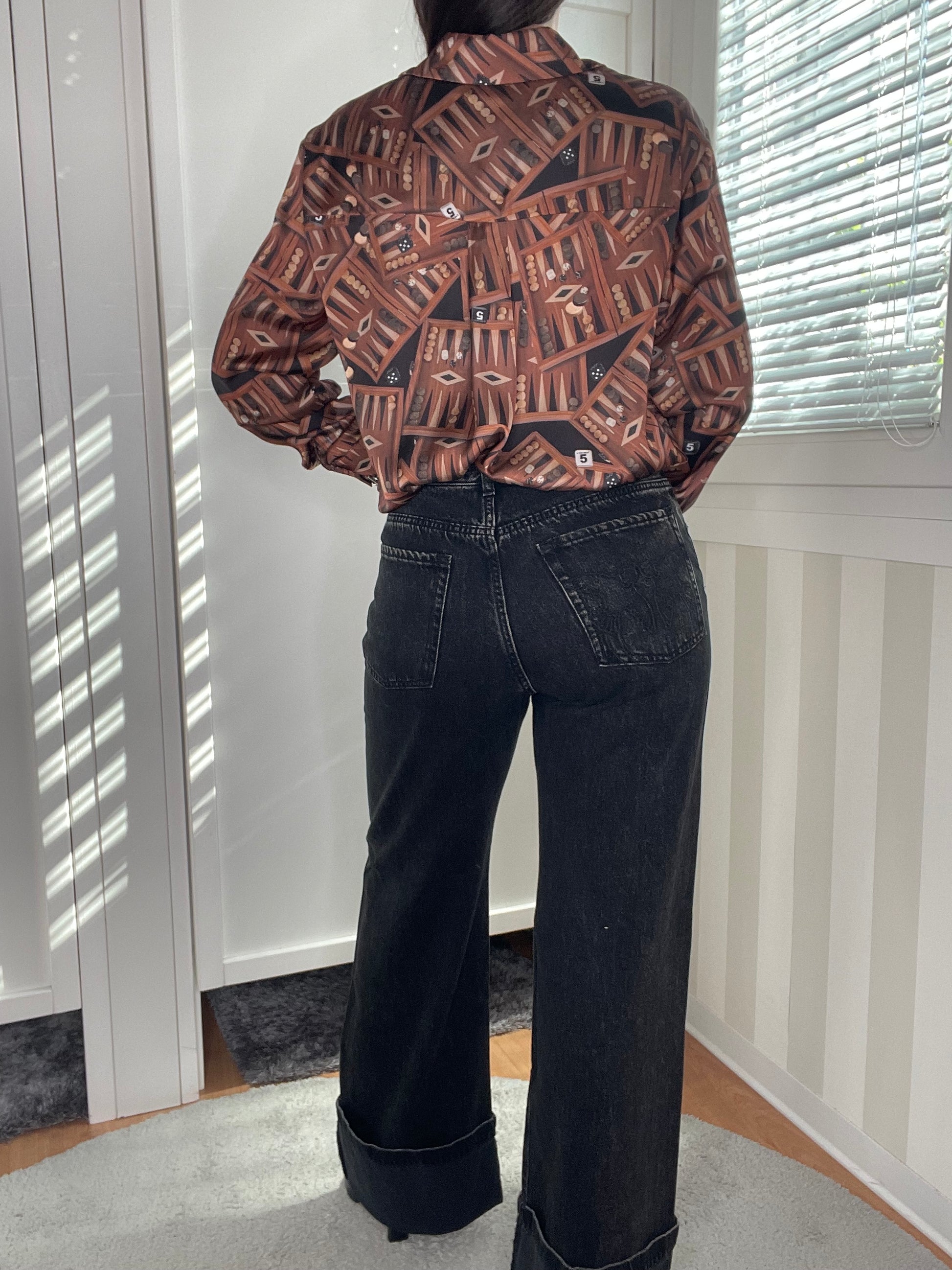 Jeans cinque tasche da donna con silhouette wide leg dalla gamba dritta e ampia con fondo risvoltato fisso. Il capo è realizzato in denim black di cotone e lyocell per una mano più fluida ed è trattato con diverse tecniche di lavaggio per raggiungere la tonalità finale. A personalizzare il design in puro stile PINKO troviamo il passante rimovibile con logo Love Birds. Gioca con gli abbinamenti e indossa questi jeans con la vita scesa e il cavallo basso per un look più maschile, oppure combinali con capi più femminili per uno stile che punta sui contrasti. Passanti per cintura e chiusura frontale con bottone e zip nascosta. Il modello veste in modo un po' più ampio rispetto alla taglia abituale.