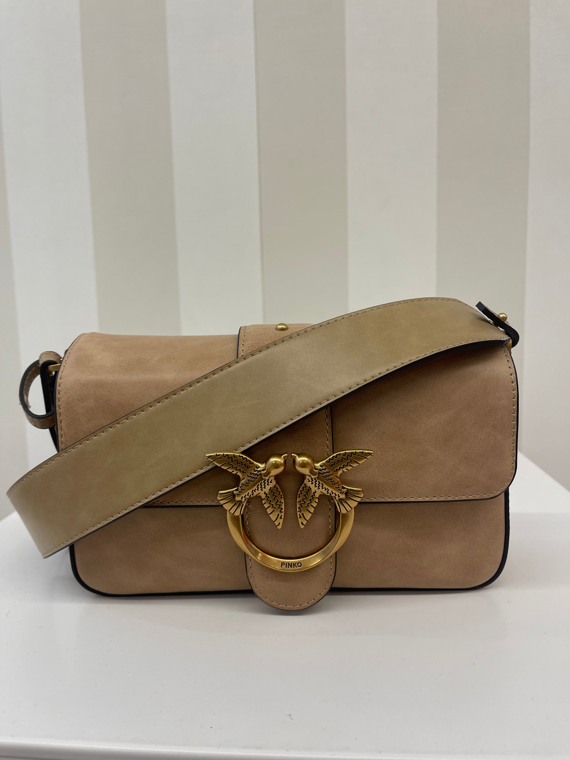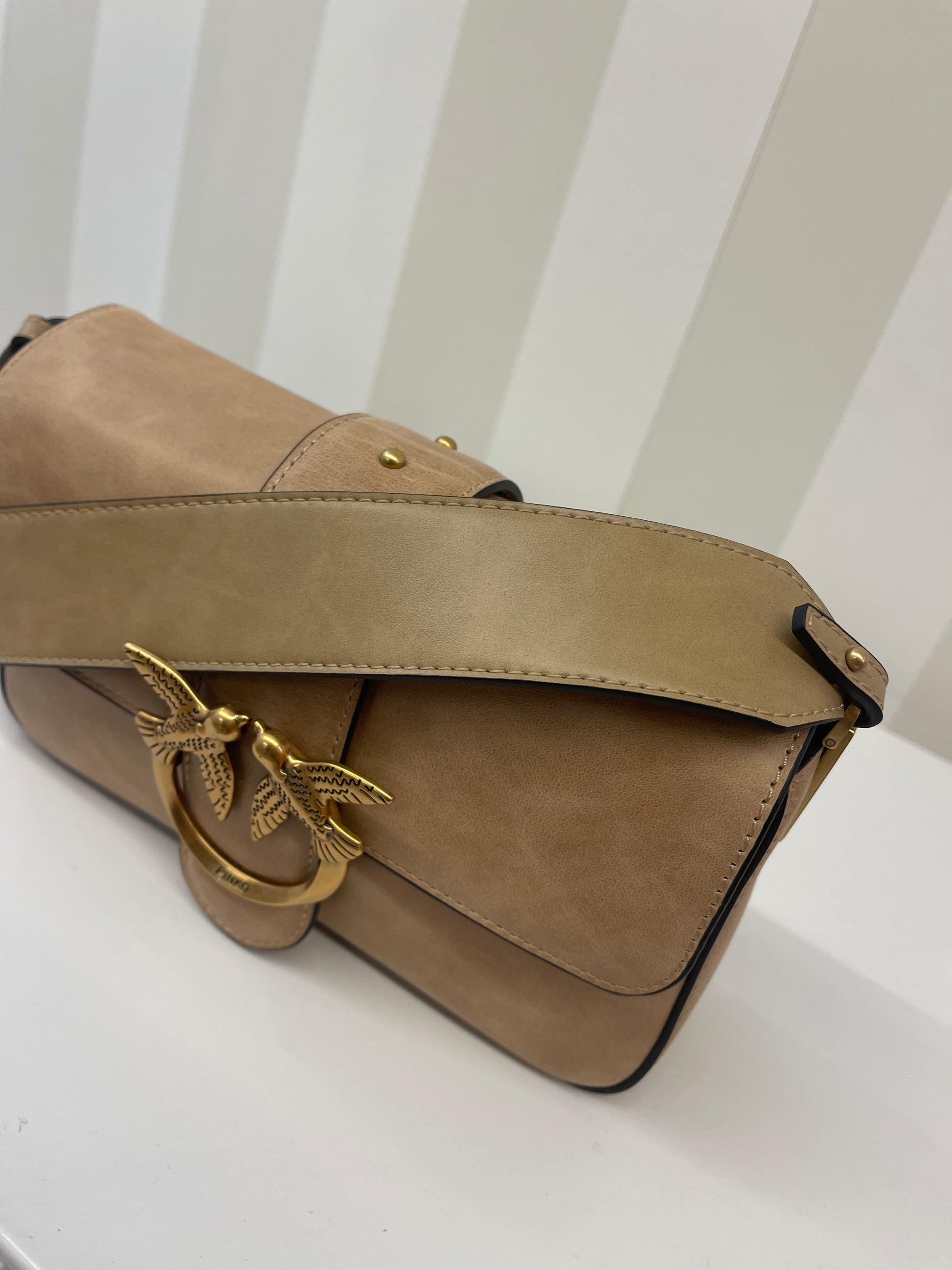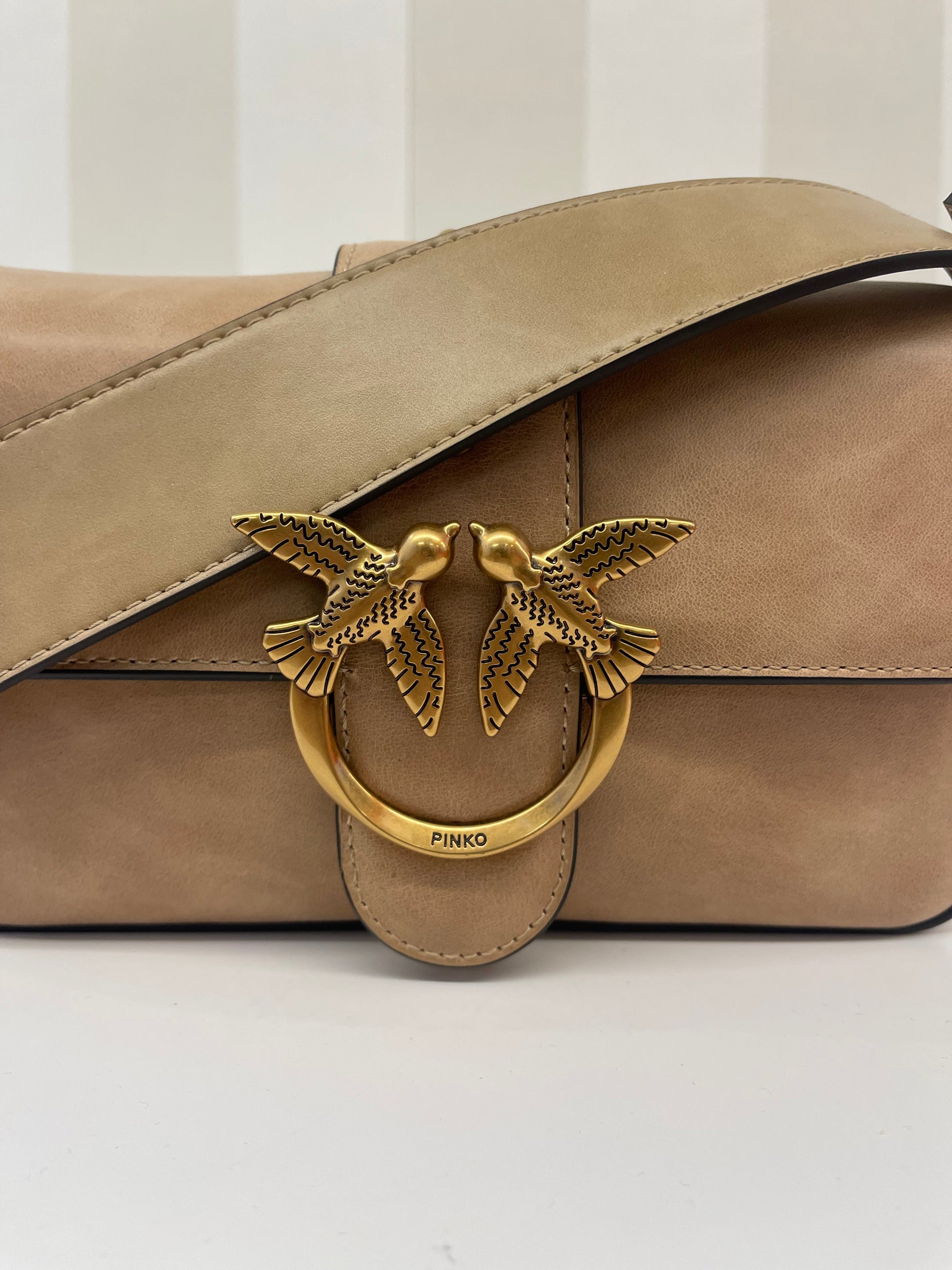 Mini bag compatta in vitello morbido dalla mano setosa, disegnata con linea leggermente morbida e profili dipinti a mano che ne valorizzano la struttura. La pattina arrotondata si chiude tramite magnete nascosto e cinturino centrale borchiato, dominato dall’iconico anello Love Birds in metallo dorato.