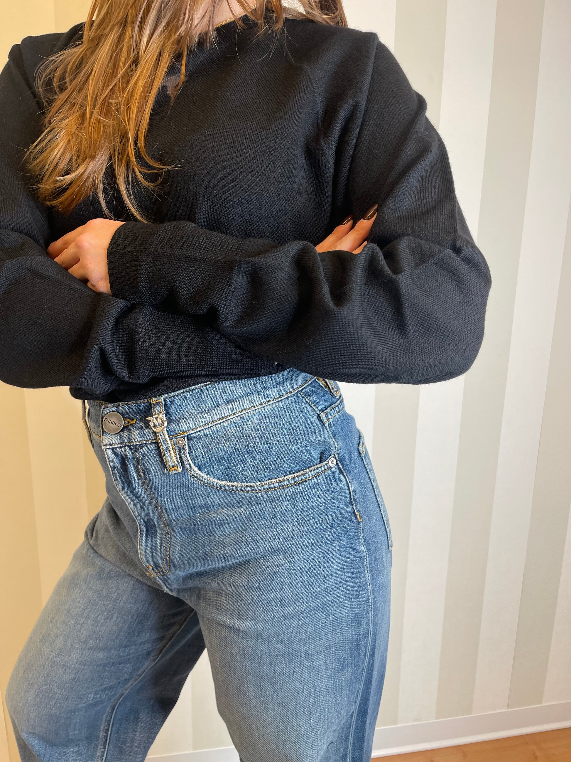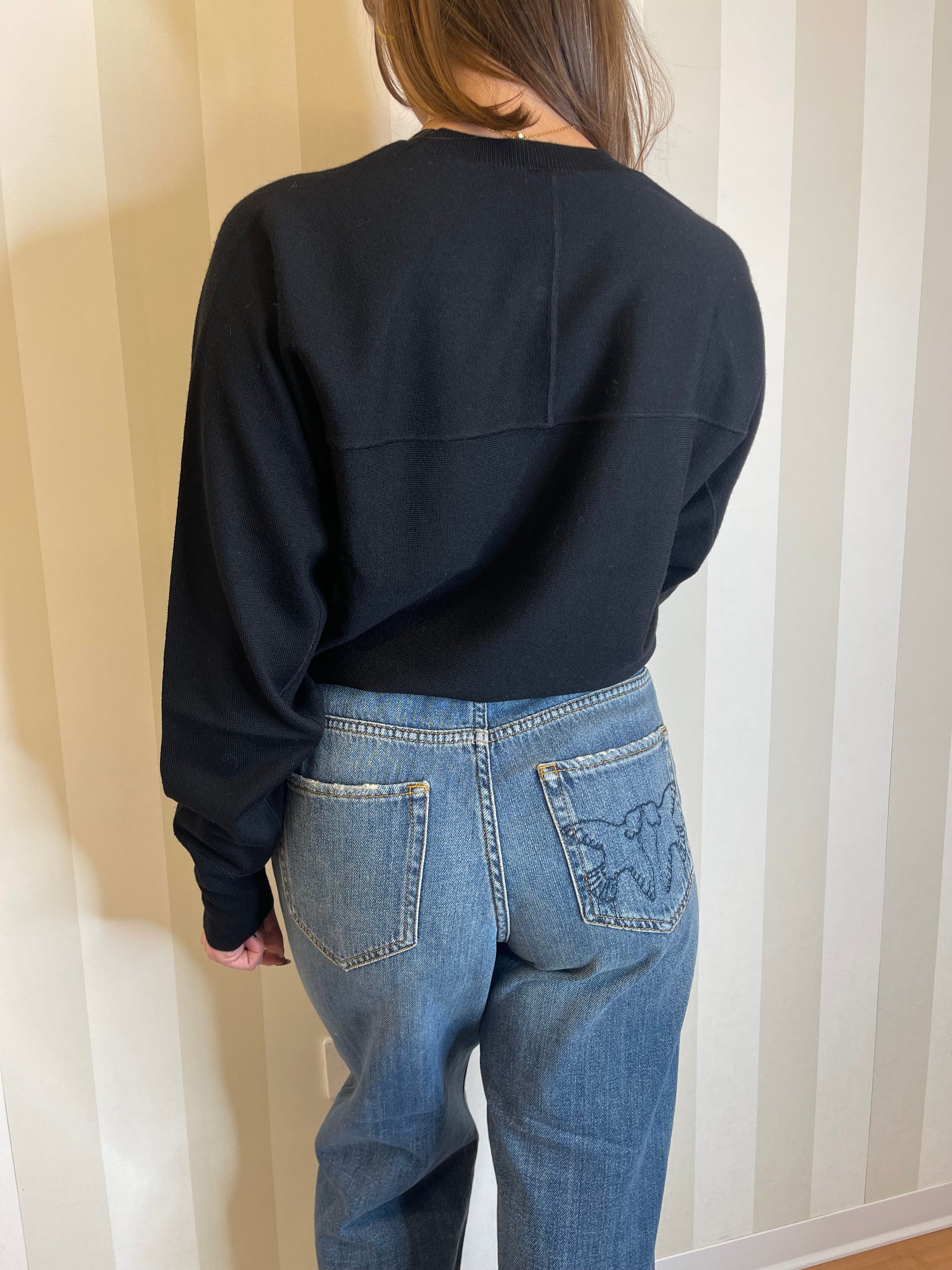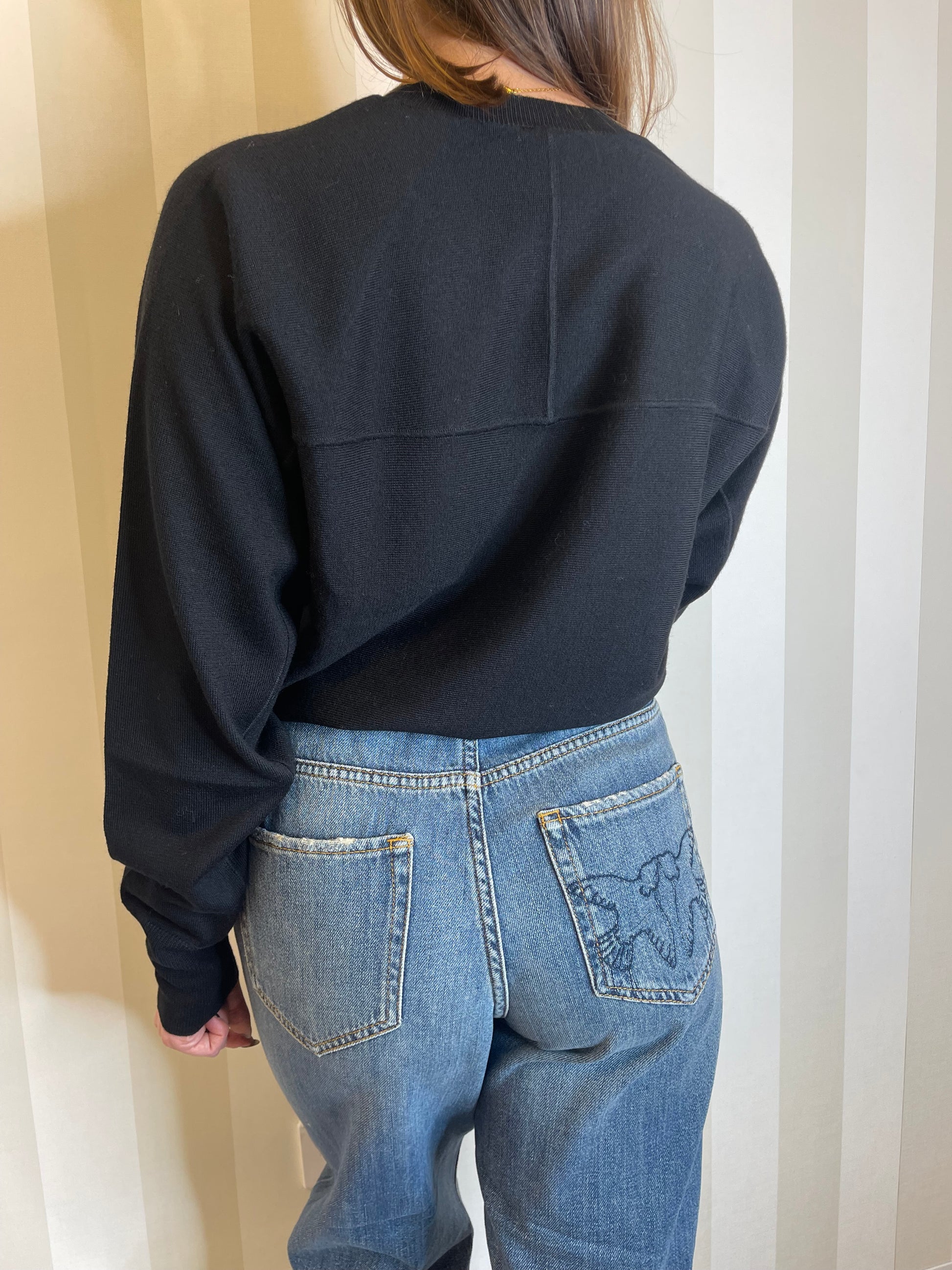 Maglia girocollo a maniche lunghe in pura lana merino, estremamente leggera e versatile. La parte frontale è caratterizzata dall'iconico logo Love Birds sotto forma di intarsio in trasparenza lavorato con tecnica dévoré che esprime appieno il DNA del brand. Il retro del capo, invece, sfoggia una cucitura a vista che ricorda la forma di un carré. Girocollo, orlo e polsini sono lavorati a coste. Il capo è stato sottoposto a prove di finissaggio per ridurre al minimo la possibile formazione di pilling, garantendo una maggiore morbidezza e durabilità del tessuto.