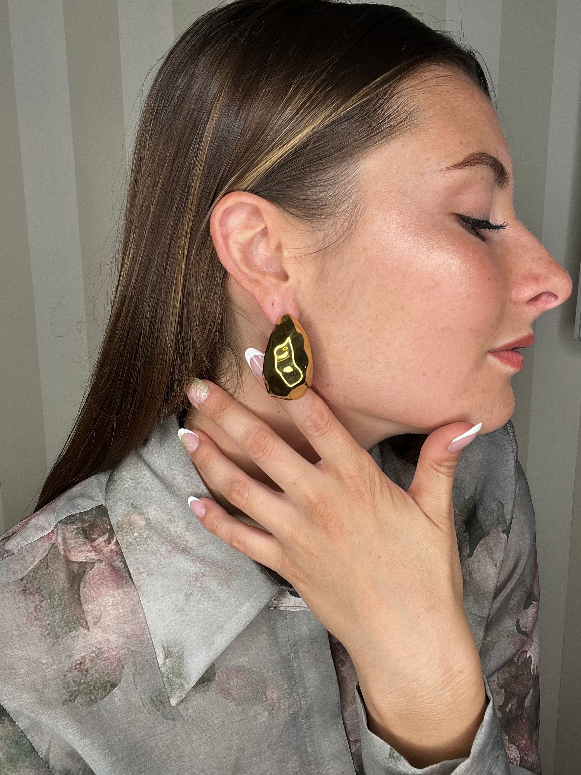 Orecchini a lobo dal design irregolare effetto martellato, piccoli ma luminosi, pensati per aggiungere un dettaglio sofisticato al look quotidiano.