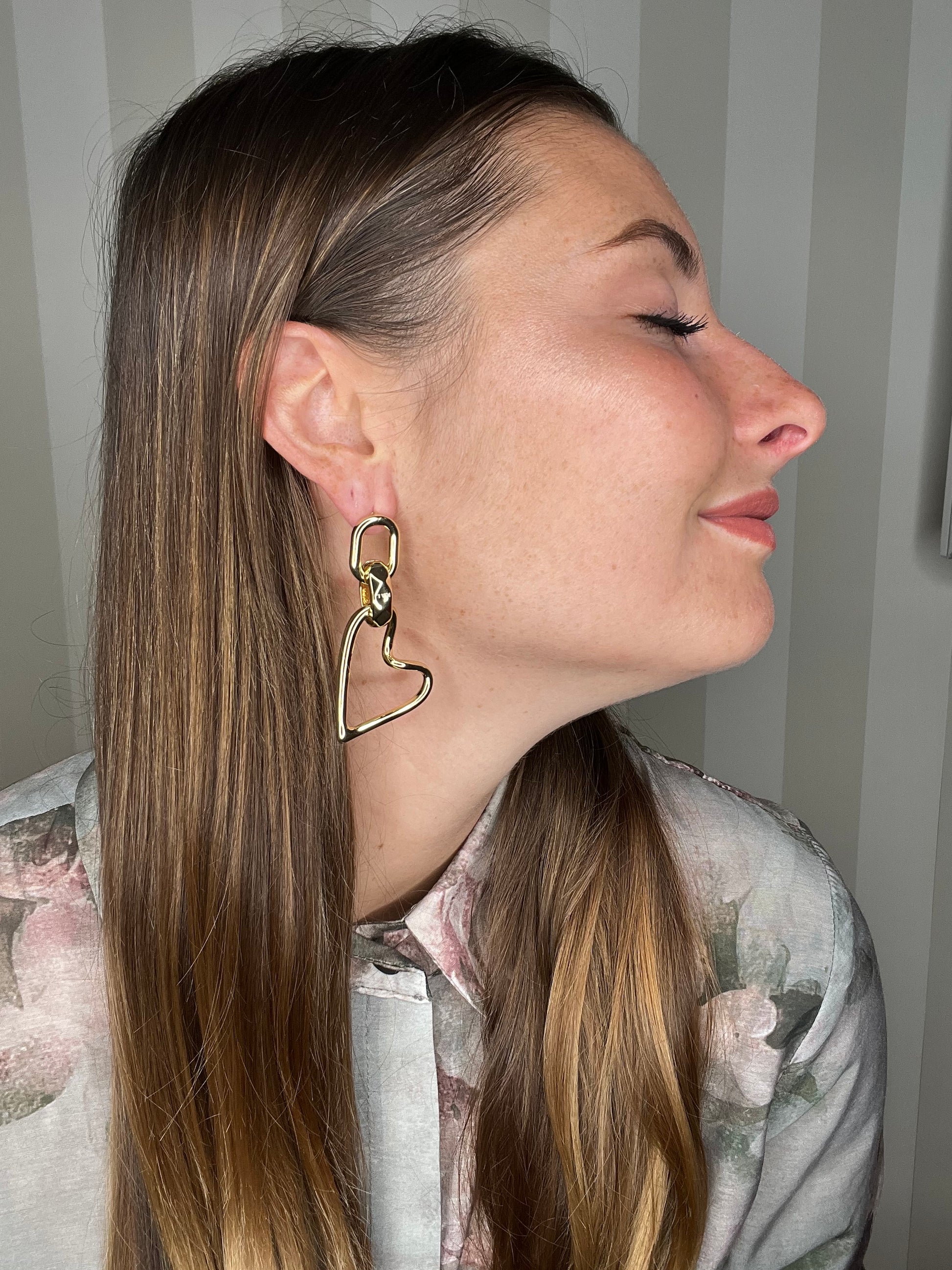 Orecchini pendenti in metallo dorato a forma di cuore stilizzato, un design romantico e moderno perfetto per esprimere personalità e stile.