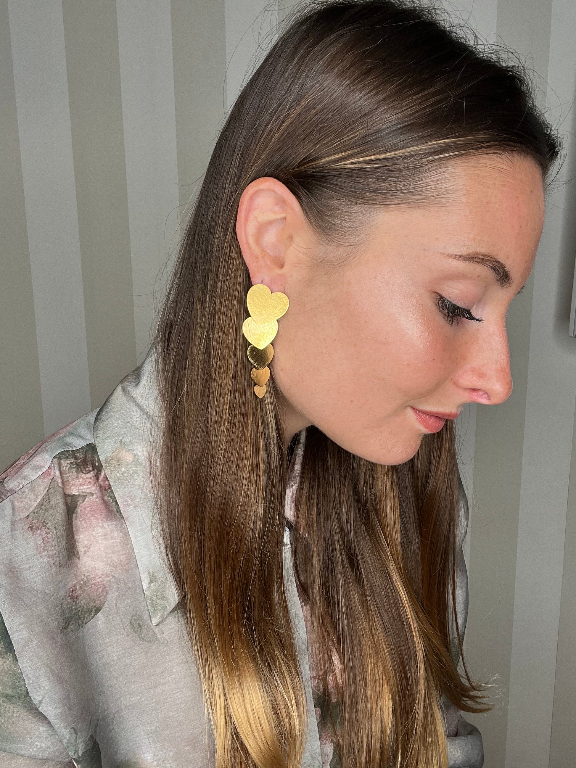Orecchini pendenti in metallo dorato con cuori sovrapposti di diverse dimensioni. Romantici e femminili, ideali per esprimere dolcezza e passione.