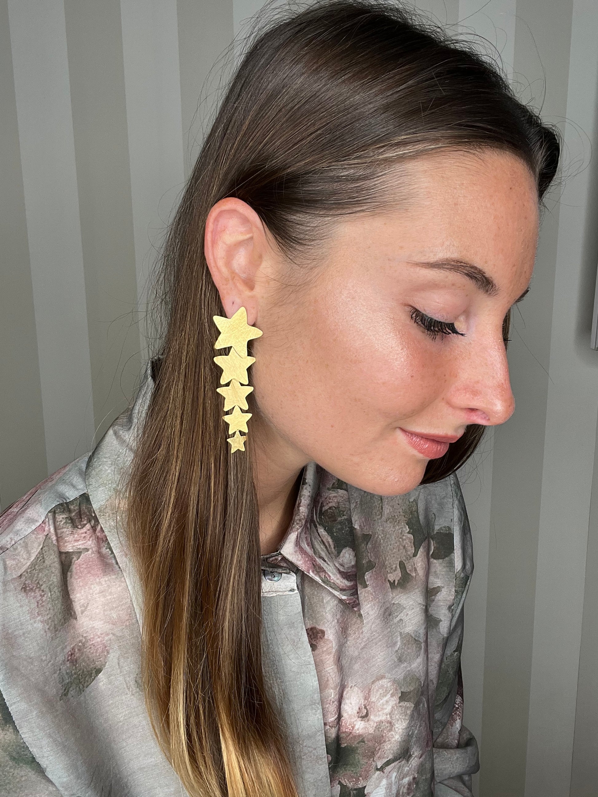 Orecchini pendenti in metallo dorato con stelle sovrapposte di diverse dimensioni. Galattici e sfiziosi.