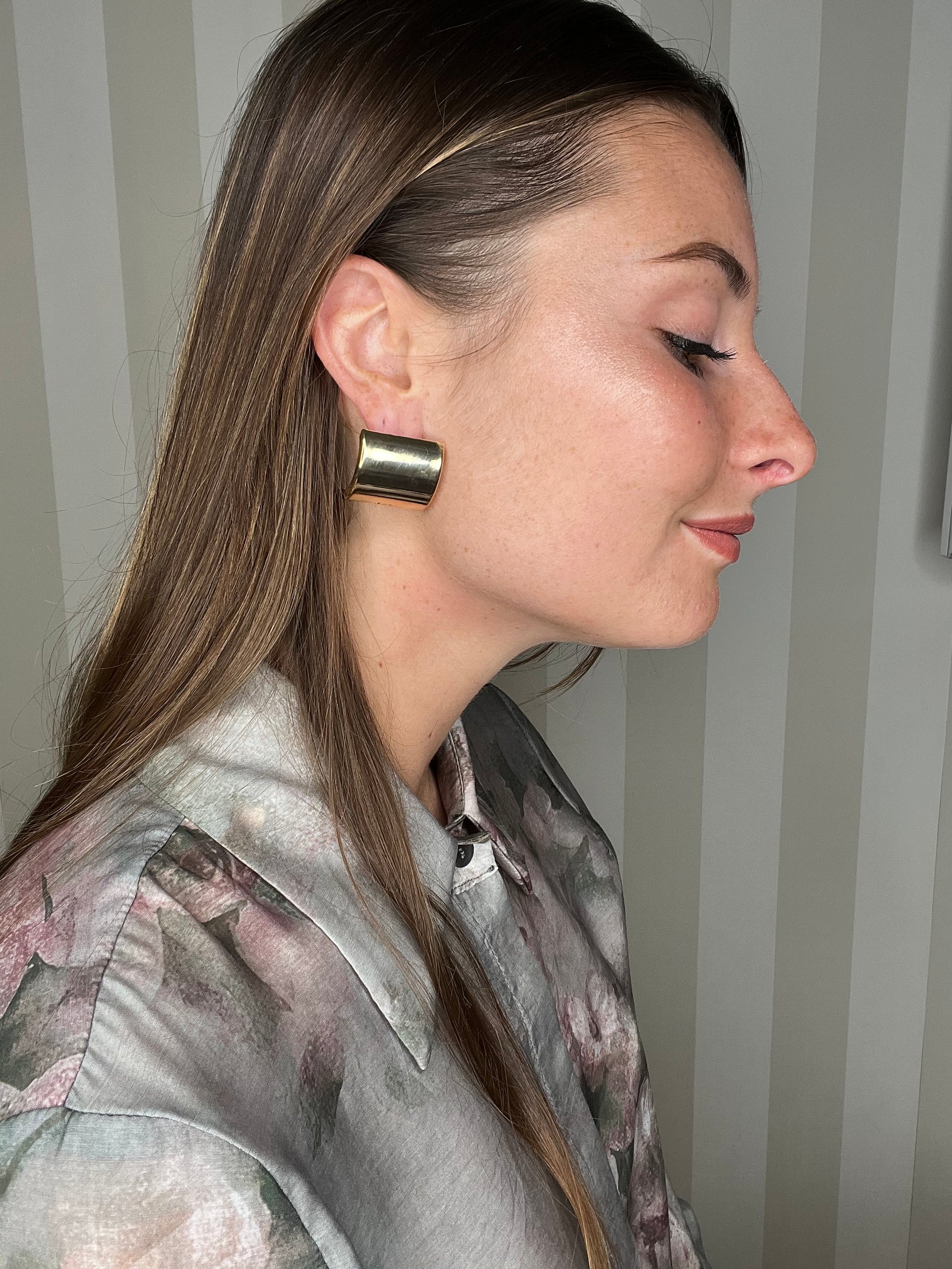 Orecchini a semicerchio in metallo oro lucido con incisione del logo, design minimal e moderno per uno stile essenziale e sofisticato.