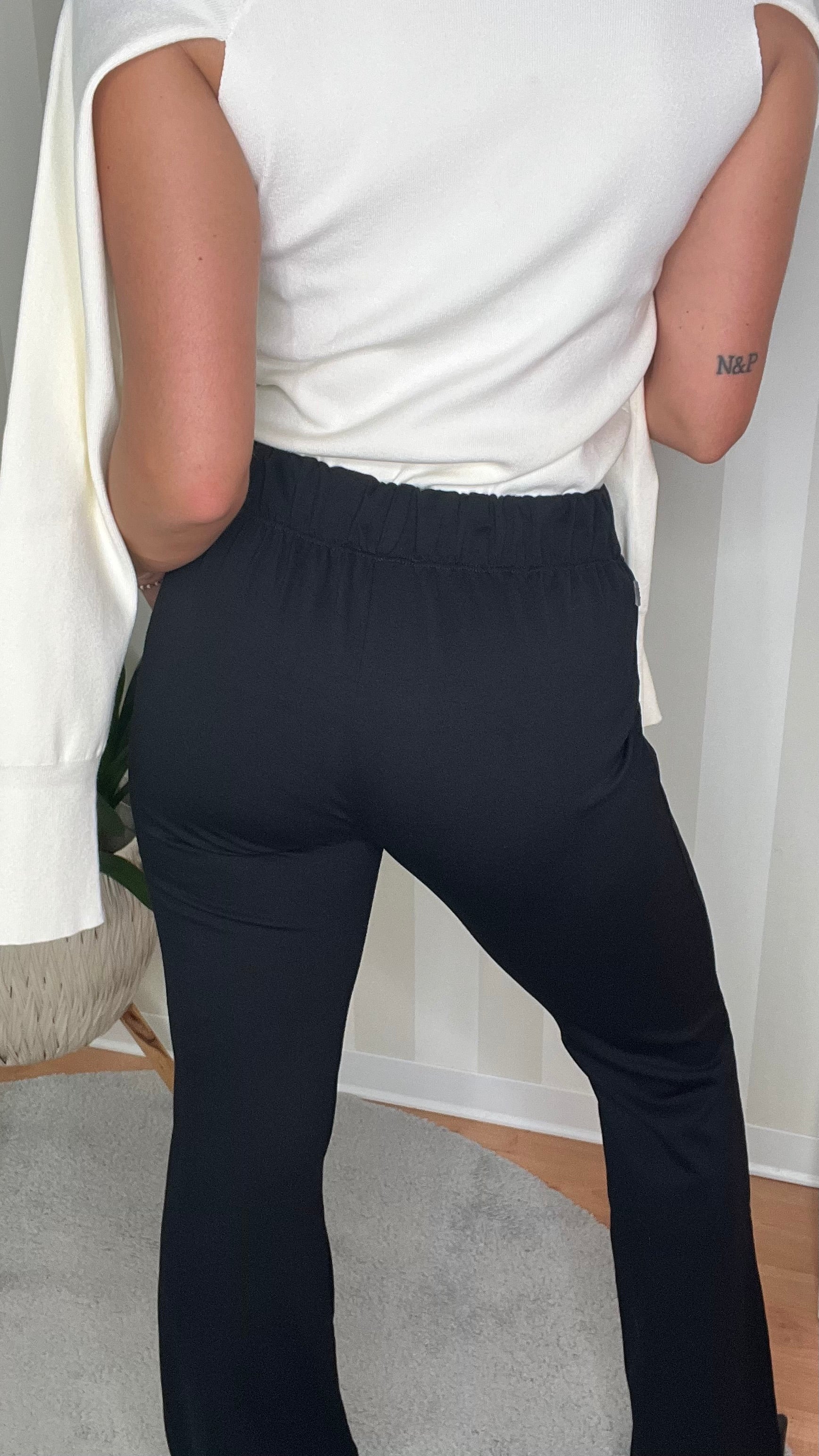 Pantalone nero dal comfort spettacolare,piatto sulla parte davanti ma con elastico sul retro. Gamba stretta sulla parte superiore e cade morbido sul fondo. Perfetto con Sneakers per un look più casual ma anche con un tacco per avere uno slancio in più.