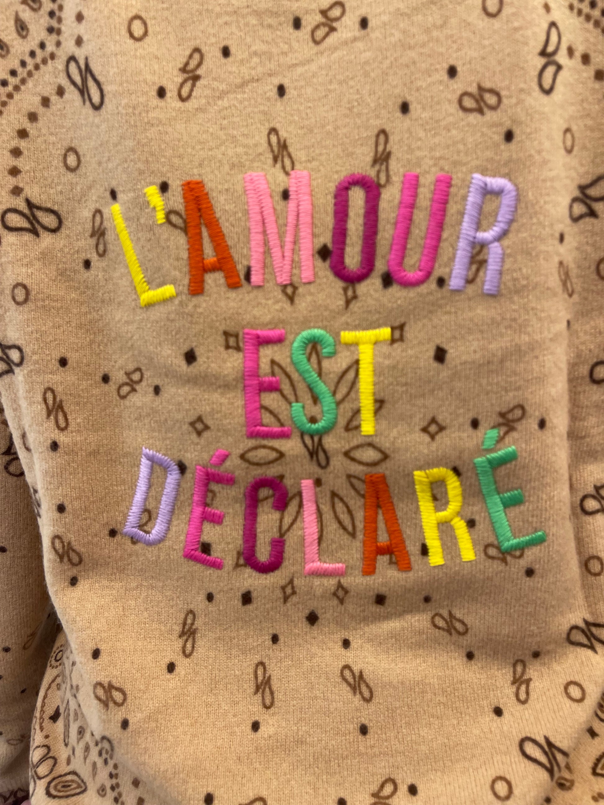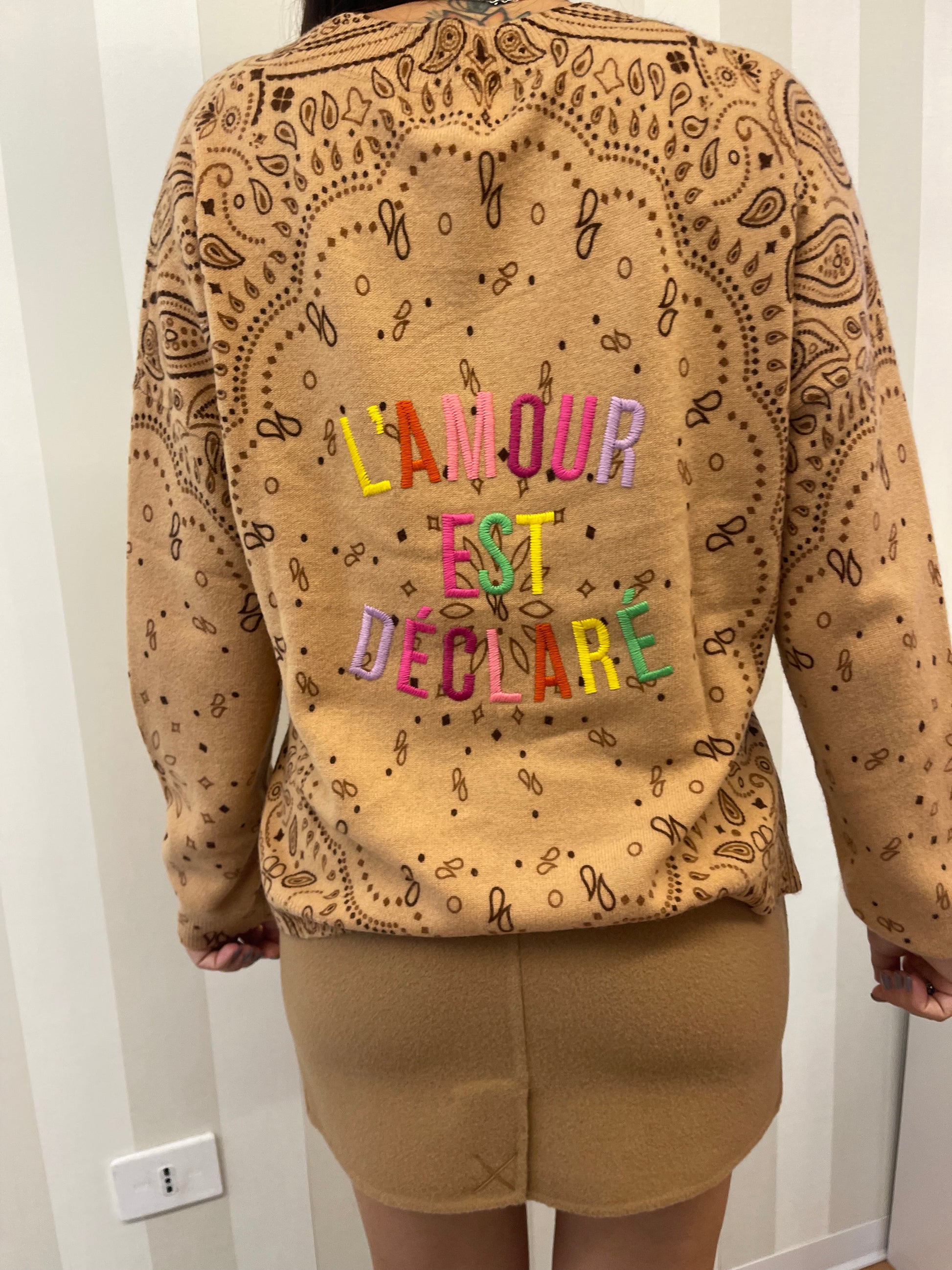 Il maglione WOODSTOCK seduce per la sua tonalità camel e il suo motivo bandana. Un ricamo multicolore "L'amore è dichiarato" sul retro, firma il pezzo con originalità, mentre il suo taglio ampio, la sua scollatura rotonda e i suoi giromani deportati rafforzano il suo spirito moderno.