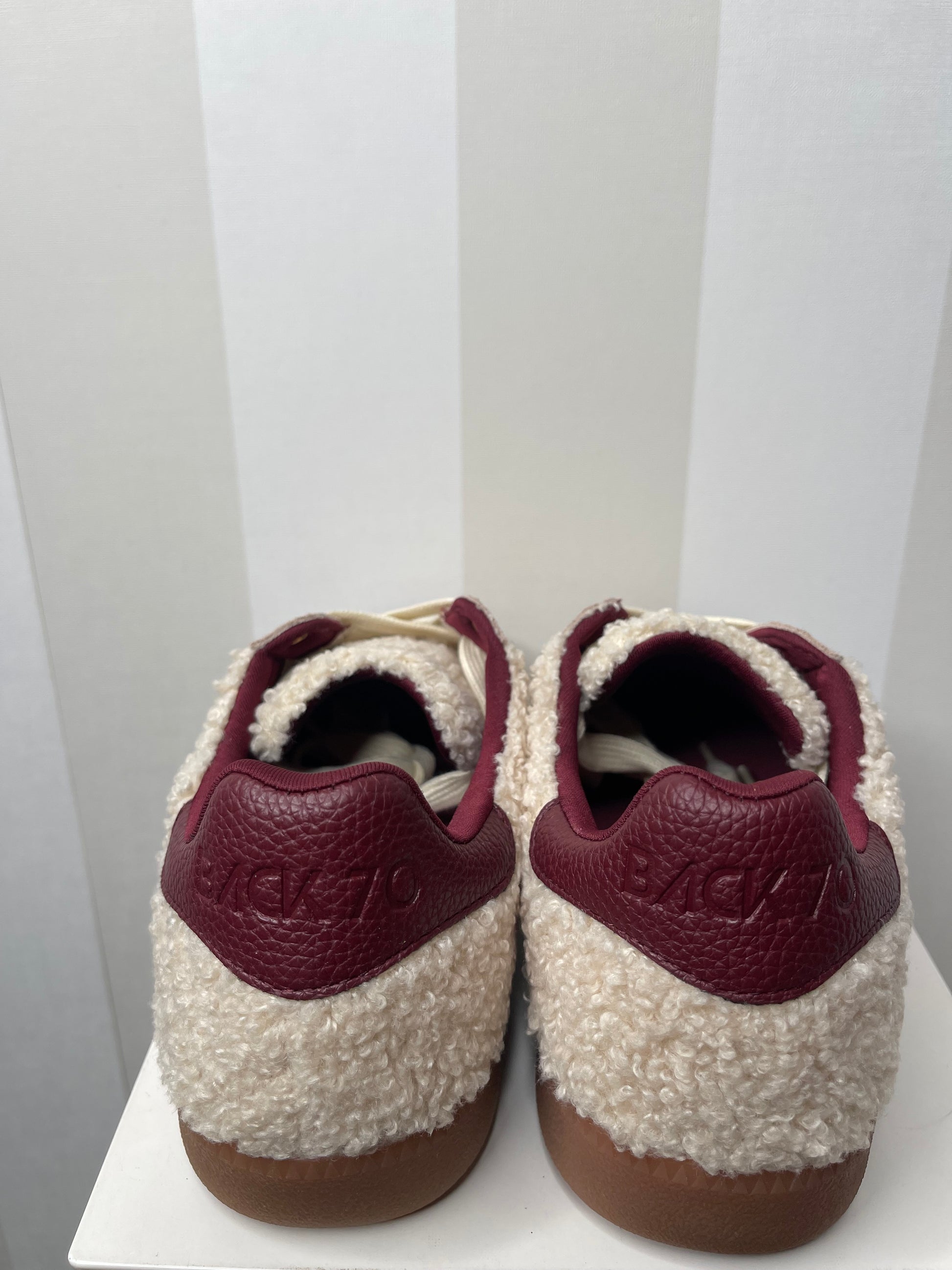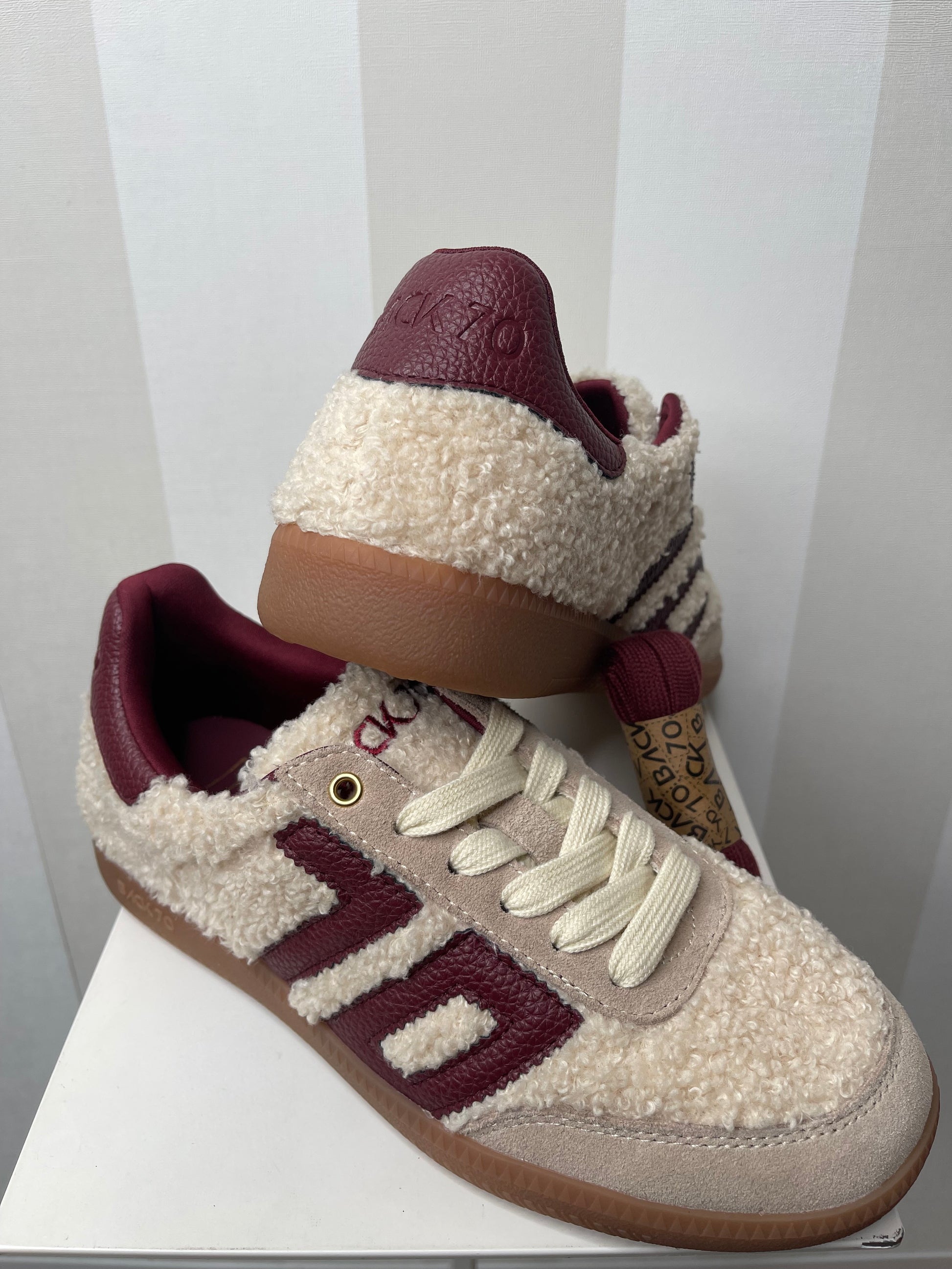Sneaker bassa con tomaia realizzata in un mix di pelle granata color bordeaux e tessuto effetto orsetto color crema. Dettagli in suede beige chiaro arricchiscono la punta e l’area intorno ai lacci. La combinazione di bordeaux, crema e beige la rende perfetta per la nuova stagione. I lati sono decorati con il numero “70” in pelle bordeaux, mentre sul tallone è presente un rinforzo in pelle bordeaux con impressa la scritta “BACK70”. La suola in gomma marrone garantisce resistenza, mentre il plantare in memory foam assicura una camminata più confortevole.