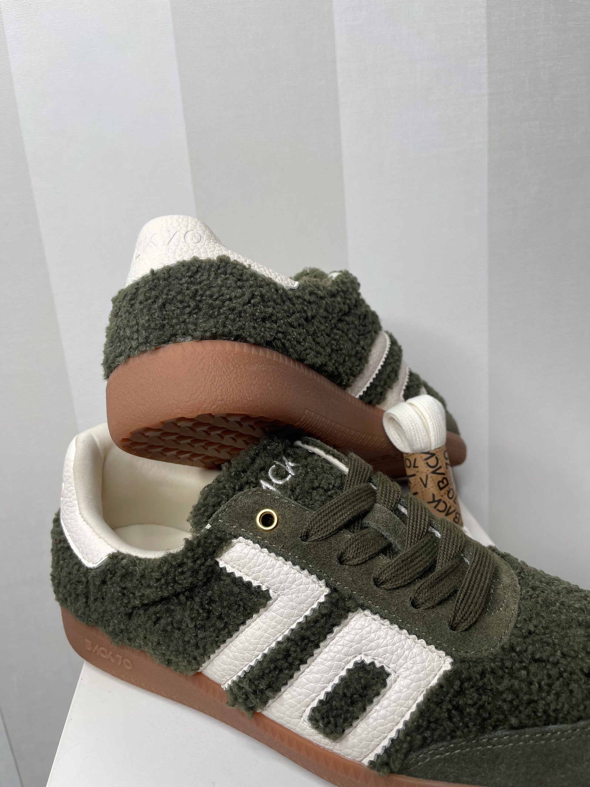 Sneakers dal design molto particolare, colore principale: verde oliva. La tomaia è composta in parte da tessuto effetto pelliccia, che dà un aspetto morbido e “invernale”. Sono presenti inserti in pelle bianca con texture a rilievo, che formano le strisce laterali e la parte posteriore del tallone. La punta e il bordo dei lacci sono in suede verde. Suola in gomma color terracotta, dallo stile classico da sneaker vintage. Lo stile è un mix tra retrò e contemporaneo, con richiami a modelli sportivi anni ’70, rivisitati con materiali moderni e più fashion.
