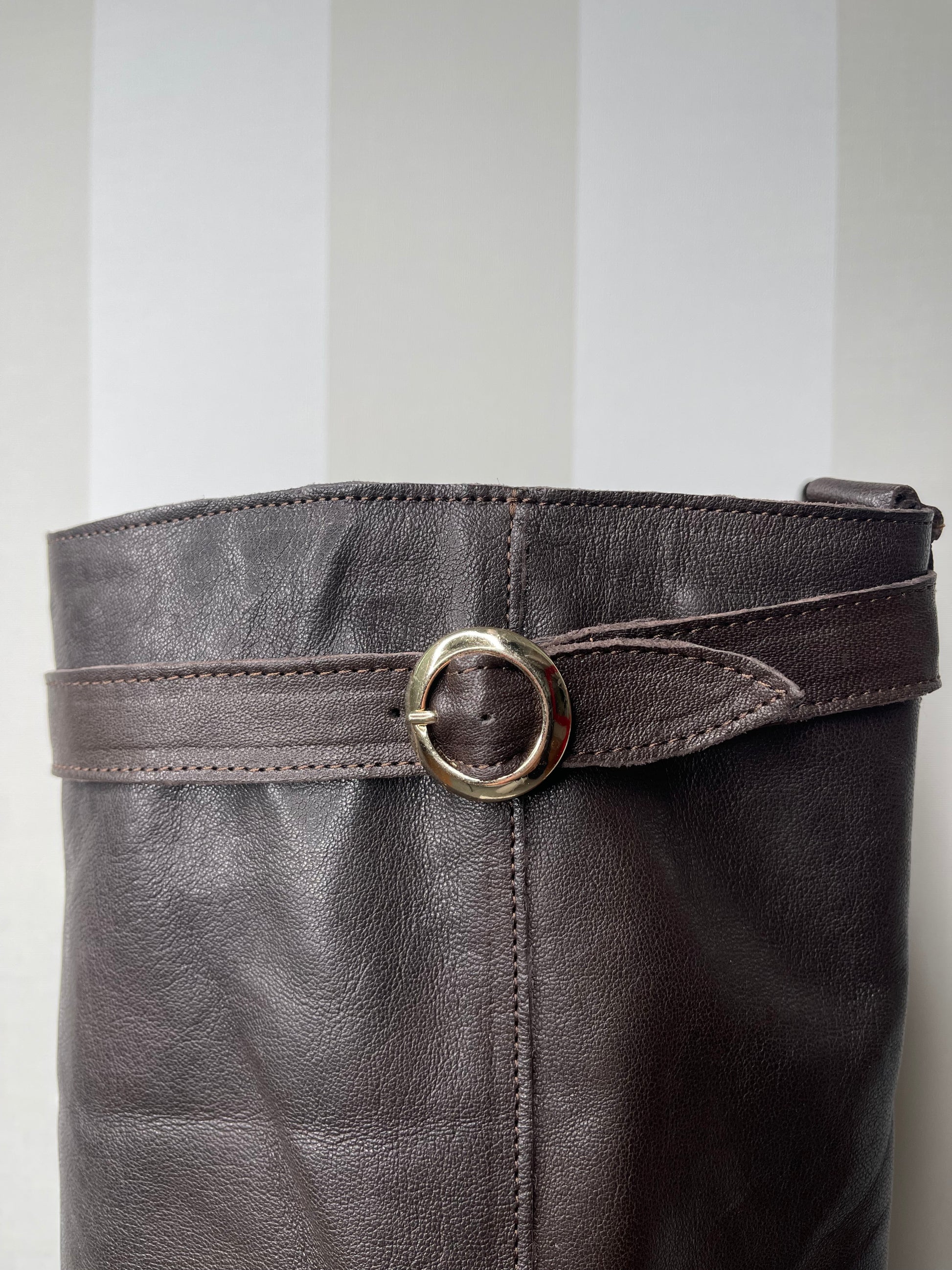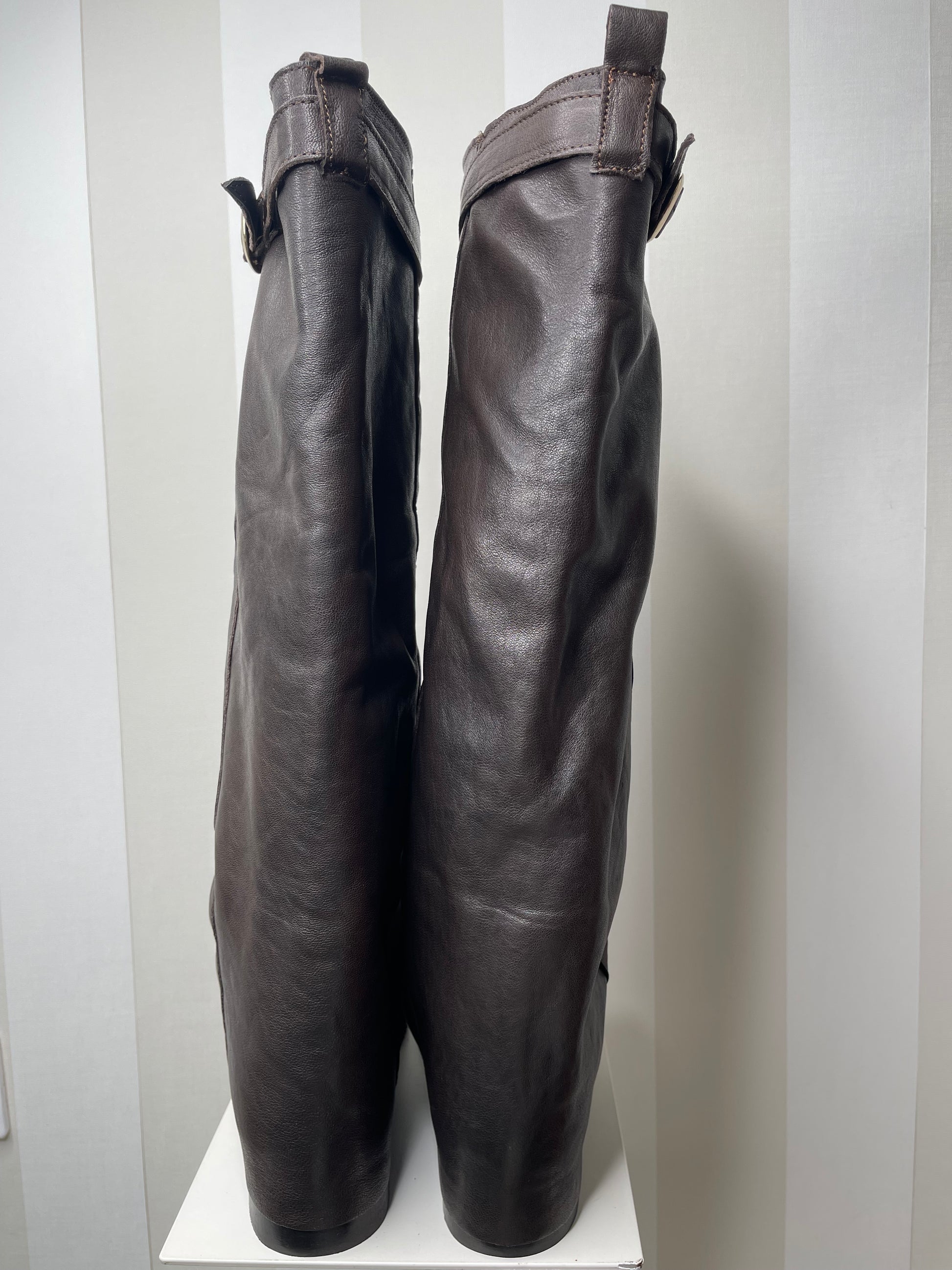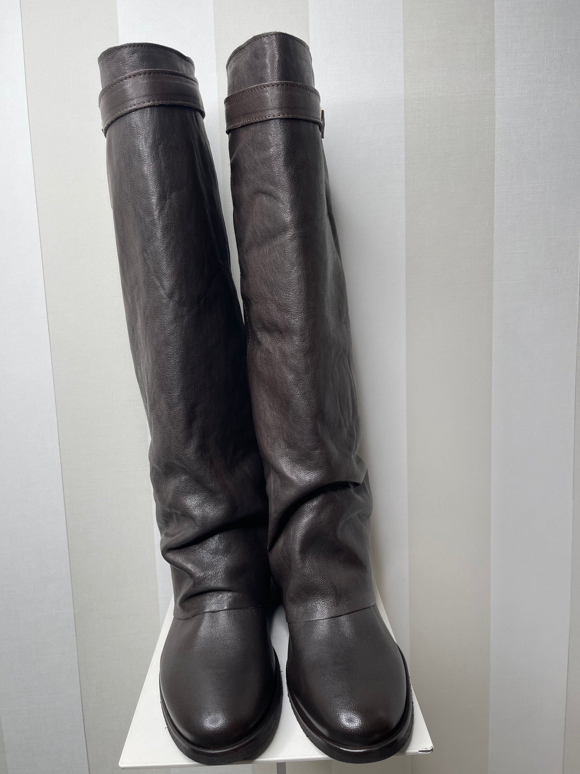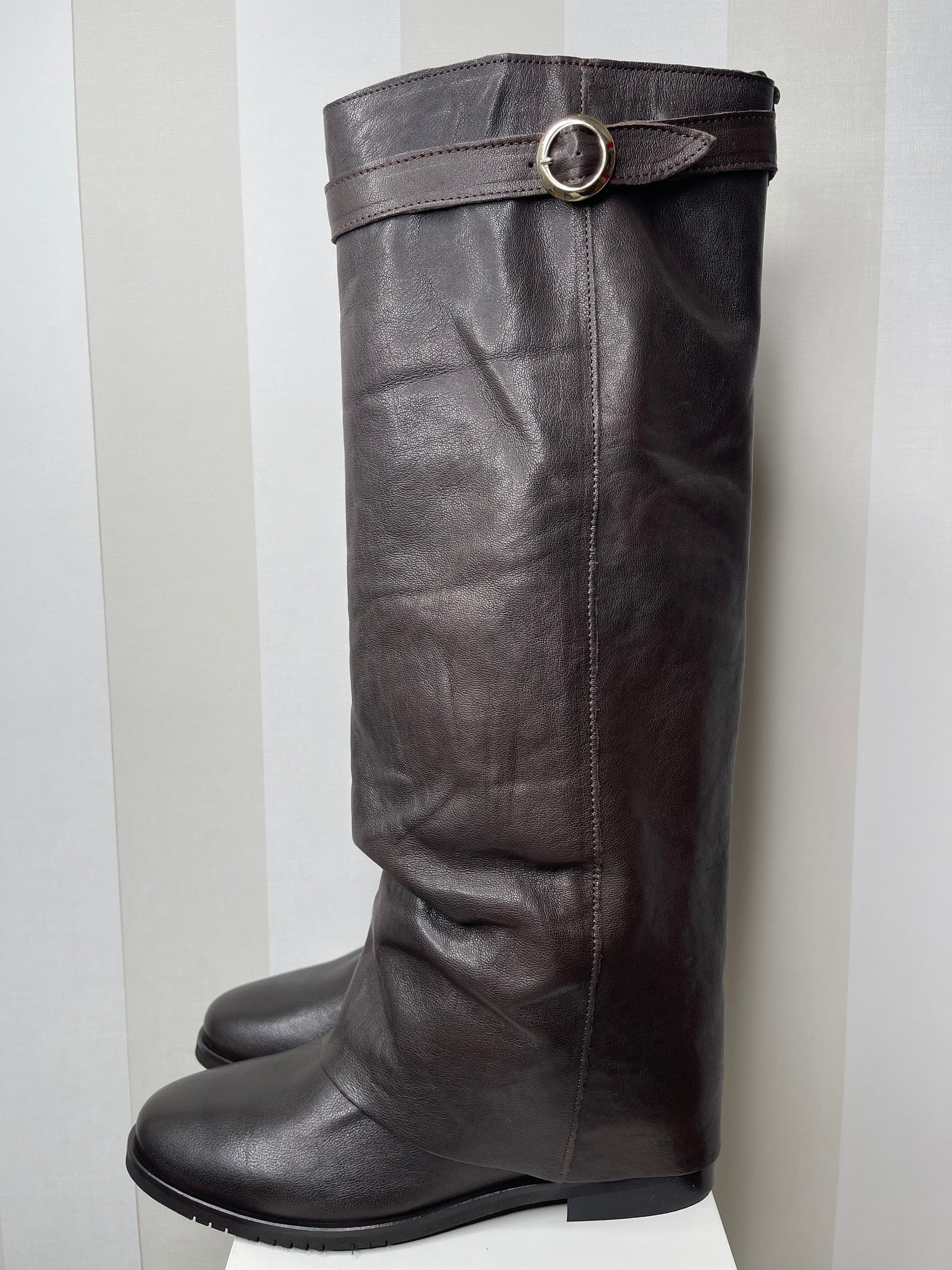 Stivali che combinano semplicità ed eleganza in un design che non passa inosservato. Realizzati in morbida pelle marrone cioccolato, uno dei colori più gettonati per questa nuova stagione.La fibbia in alto e il risvolto completano lo stile con un tocco di originalità. La suola lì rende estremamente leggeri, assicurando comfort per tutto il giorno. Perfetti per un pomeriggio casual ma anche per una serata importante.