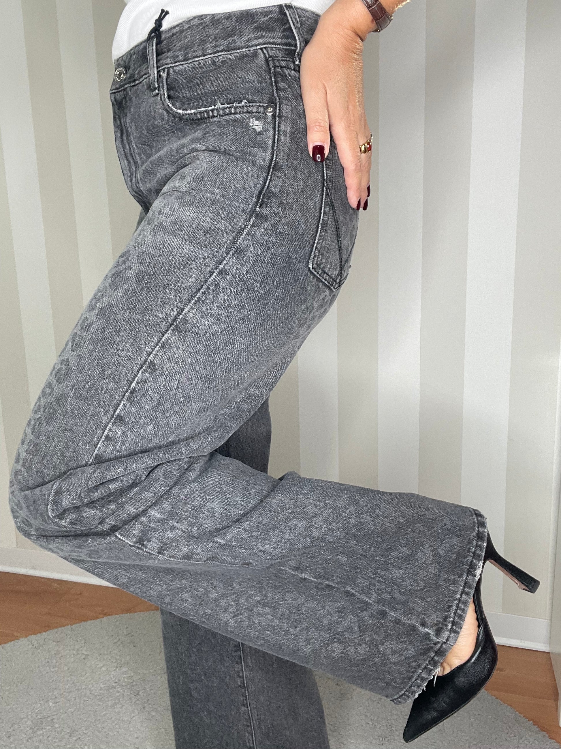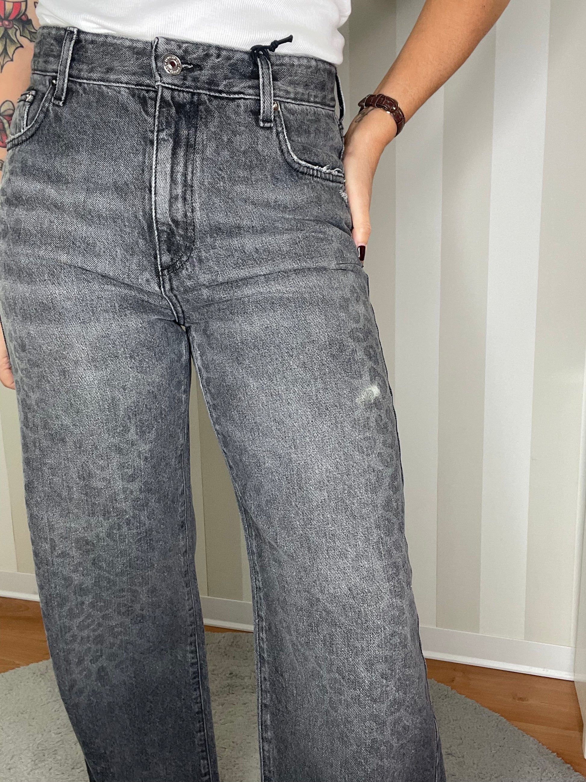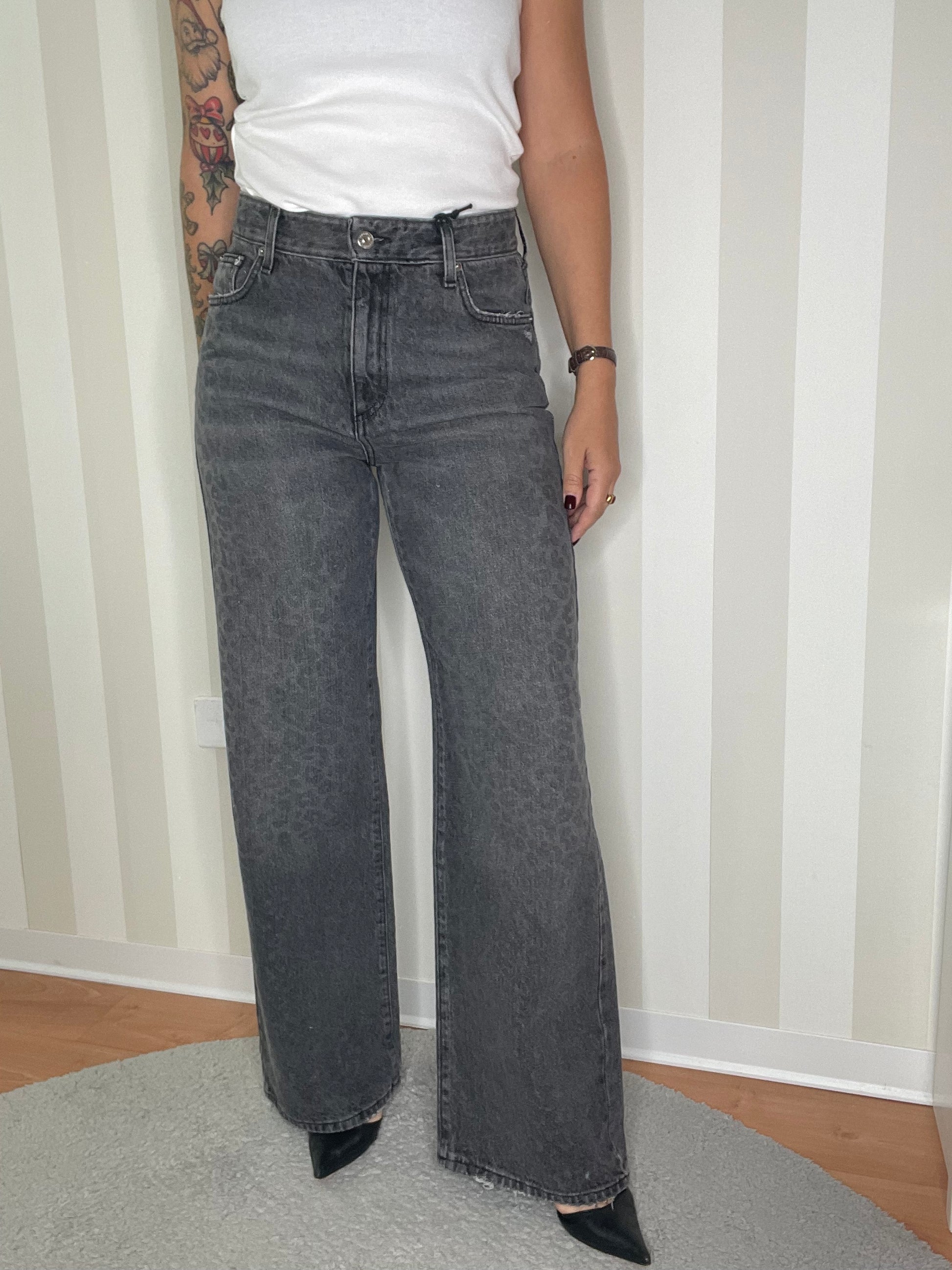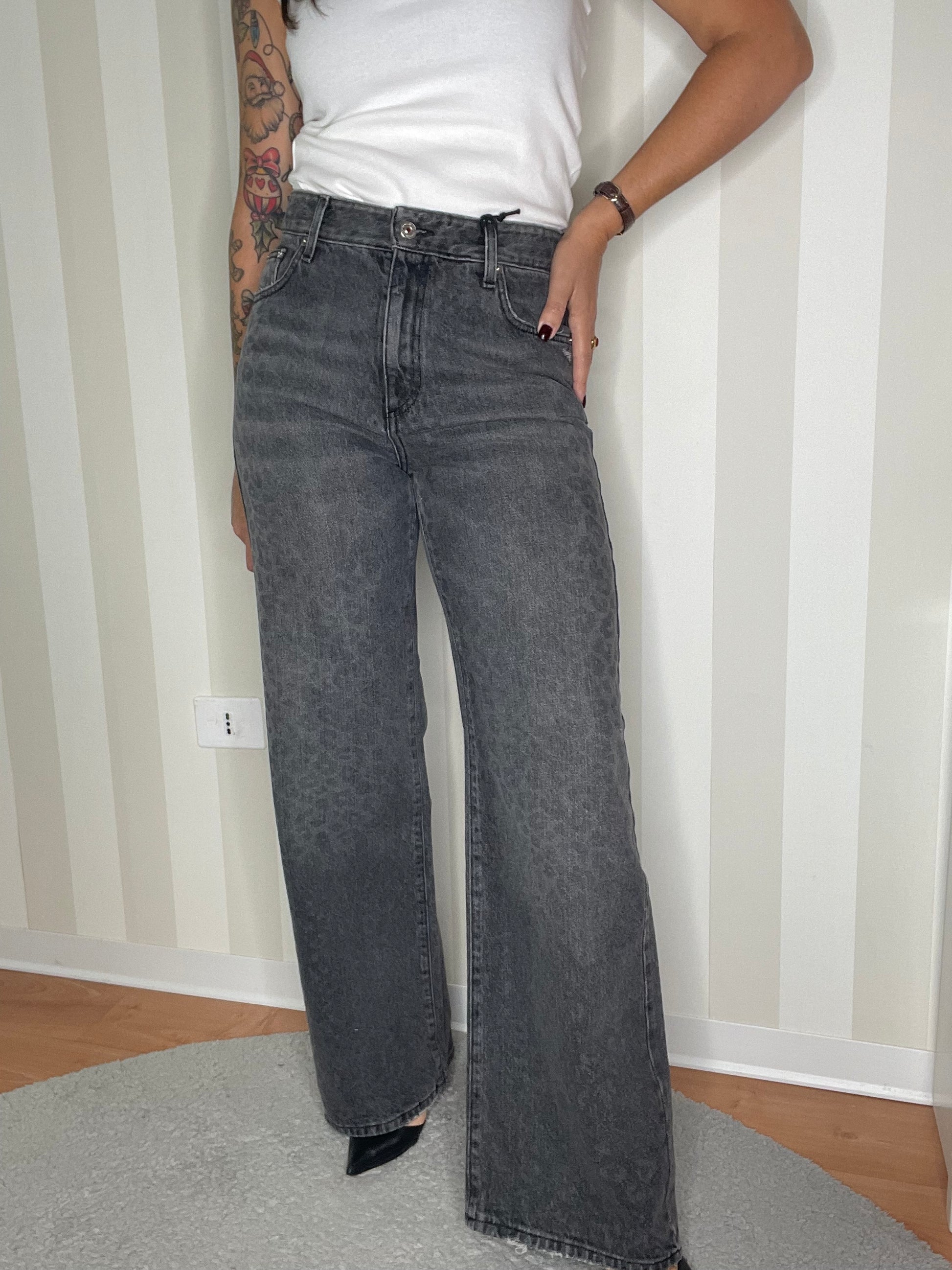 Jeans dal lavaggio grigio con trama leopardata delicata. Vita alta da appoggiare ai fianchi con gamba ampia. Jeans WIDE leg.