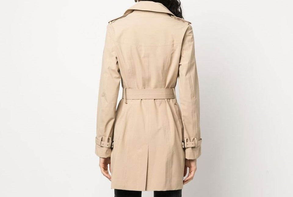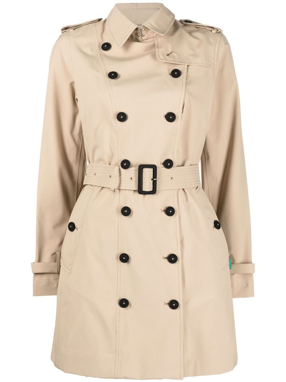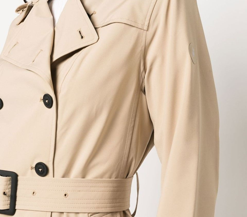 Non mancano i dettagli del classico modello all’inglese, come la chiusura doppiopetto, la cintura impunturata in vita e i cinturini regolabili ai polsi.